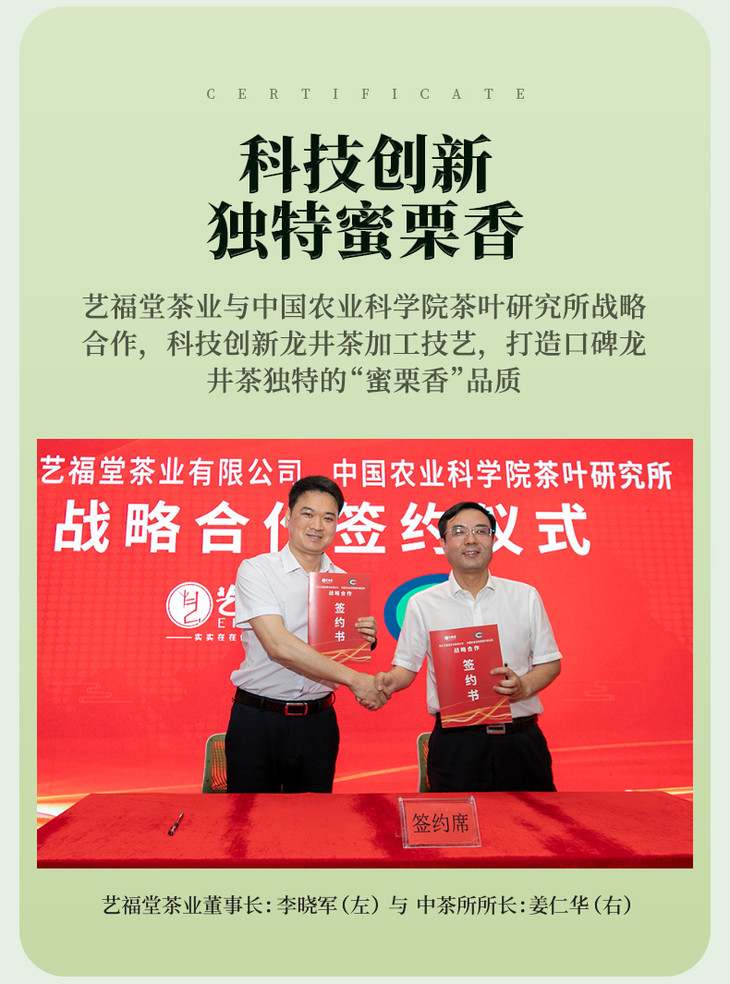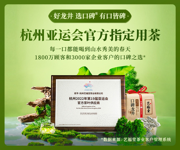 - “艺福堂茶业”创立于2008年,是一家集生产、销售、科研为一体的现代茶业企业,主打西湖龙井,兼营世界各地名优茗茶及花草茶,是中国茶行业为数不多的年销售额过5亿的品牌之一,是杭州亚运会官方指定用茶!