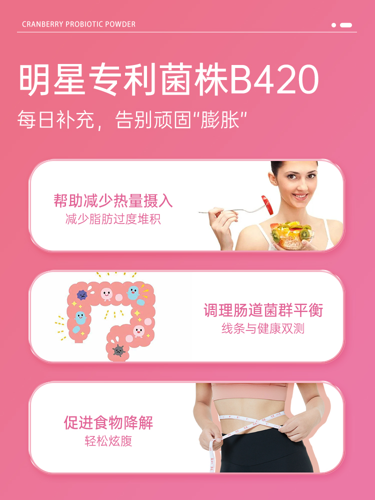【成分】低聚异麦芽糖、抗性糊精(水溶性膳食纤维)、蔓越莓果粉、全脂乳粉、植物乳杆菌JYLP-002、长双歧杆菌JBLC-141(1%)、两歧双歧杆菌BB-20(1%)、植物乳杆菌JYLP-326、长双歧杆菌BLG-19(1%)、副干酪乳杆菌JLPF-176(1%)、青春双歧杆菌BBF-06、短双歧杆菌BBR-15、嗜酸乳杆菌JYLA-191、罗伊氏乳杆菌JYLB-131、乳酸菌复配粉(乳双歧杆菌B420(93.5%)、聚葡萄糖)(0.5%)、L-阿拉伯糖、低聚果糖、柑橘纤维、白芸豆提取物