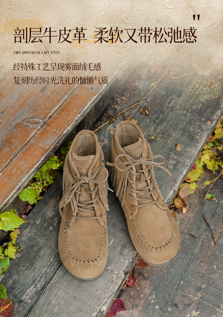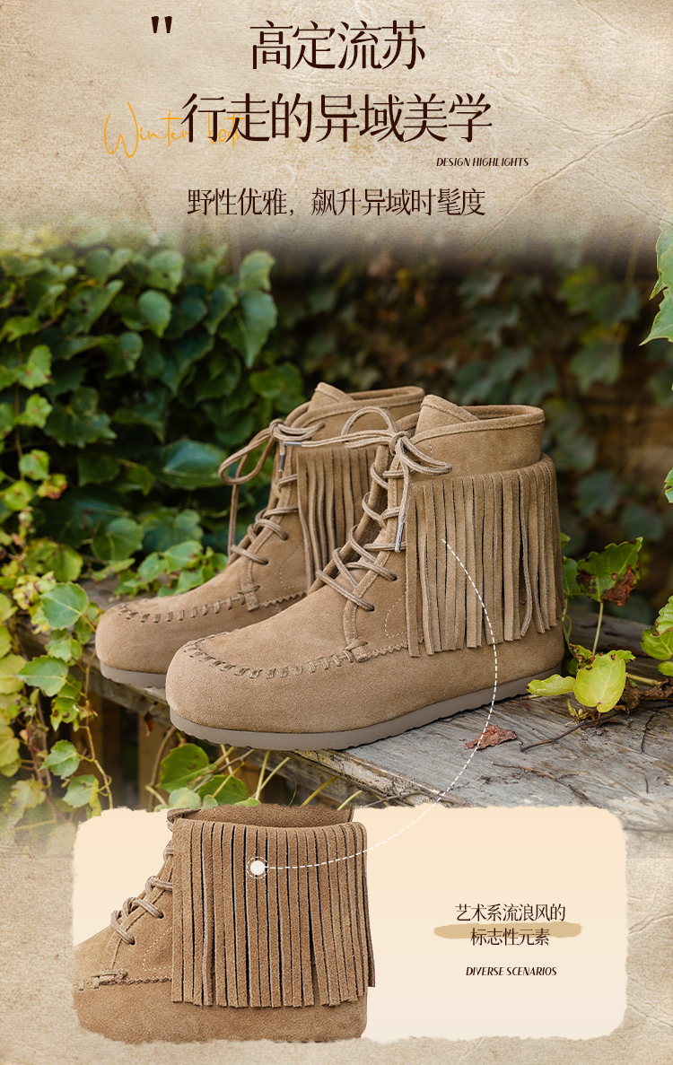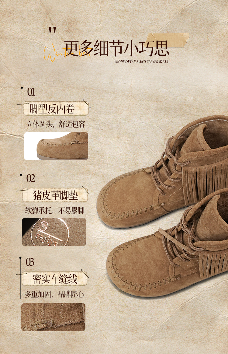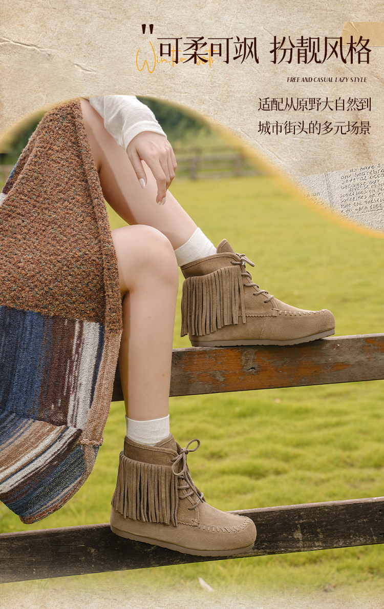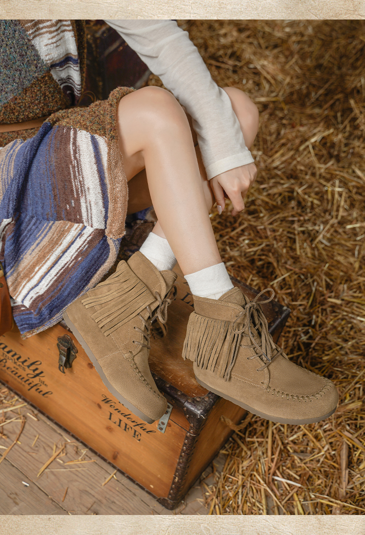 Safiya/索菲娅2025流苏游牧风系带休闲绒面复古百搭中筒西部靴SFD4116419