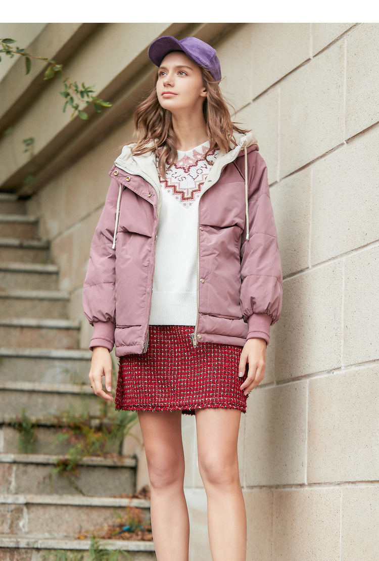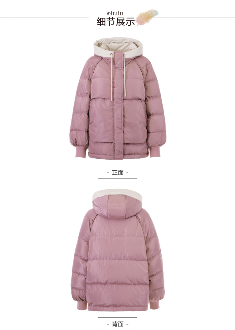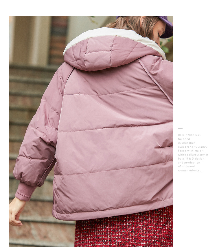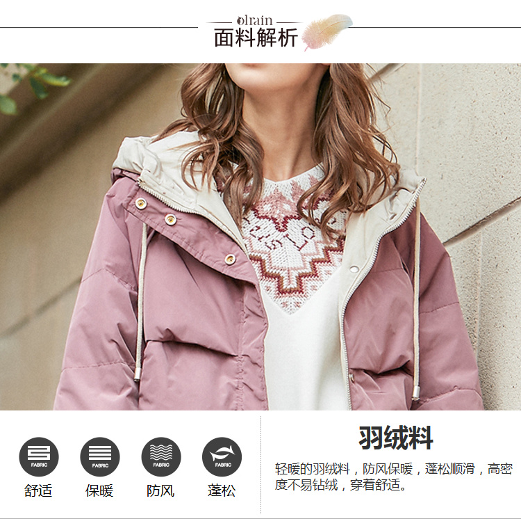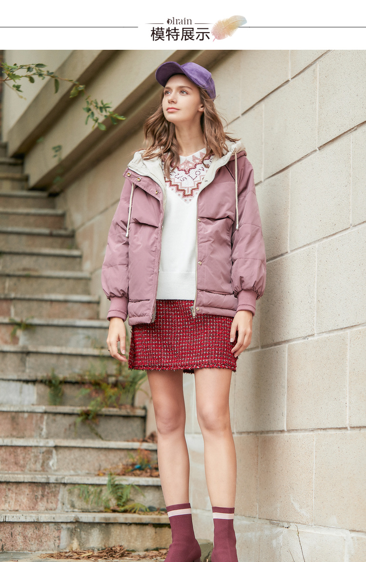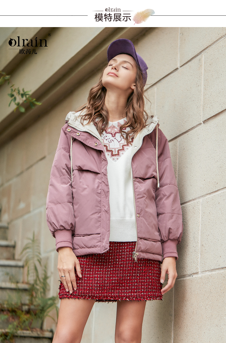 欧芮儿粉紫色连帽羽绒服女2019新款冬复古百搭短款外套百搭