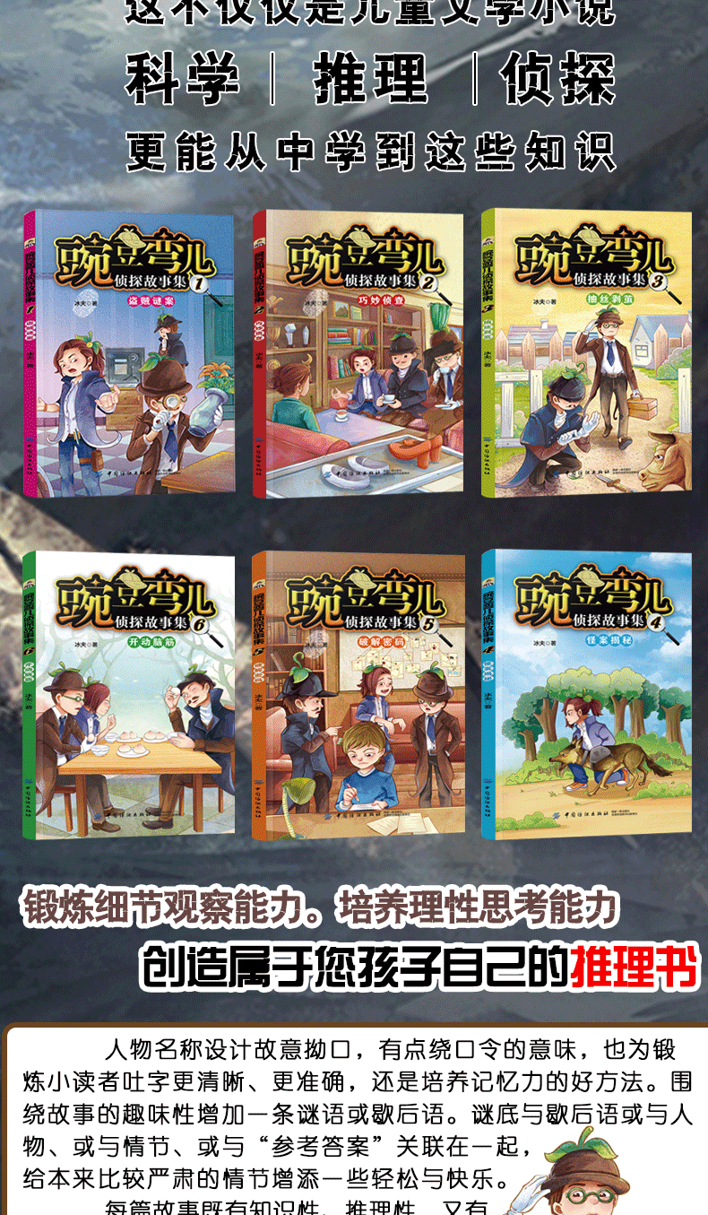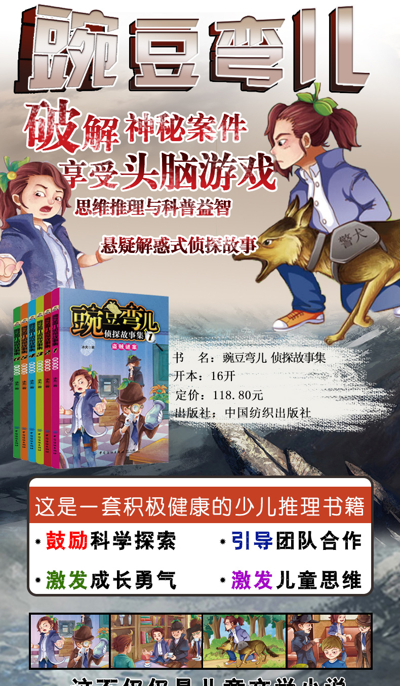 《豌豆弯儿侦探故事集(全6册)》是一套将思维推理与科普益智结合在一起的悬疑解惑式侦探故事,每篇故事的侦破推理过程,都由探长豌豆弯儿和助手豆弯弯儿、弯弯儿豆三个主要人物完成。人物名称设计故意拗口,有点绕口令的意味,也为锻炼小读者吐字更清晰、更准确,还是培养记忆力的好方法。围绕故事的趣味性增加一条谜语或歇后语。谜底与歇后语或与人物、或与情节、或与“参考答案”关联在一起,给本来比较严肃的情节增添一些轻松与快乐。
