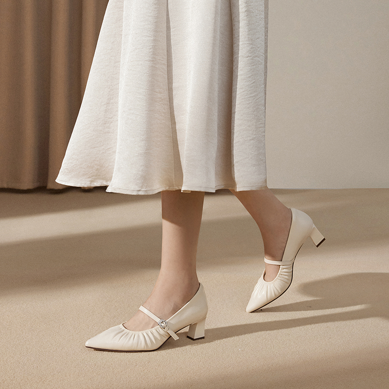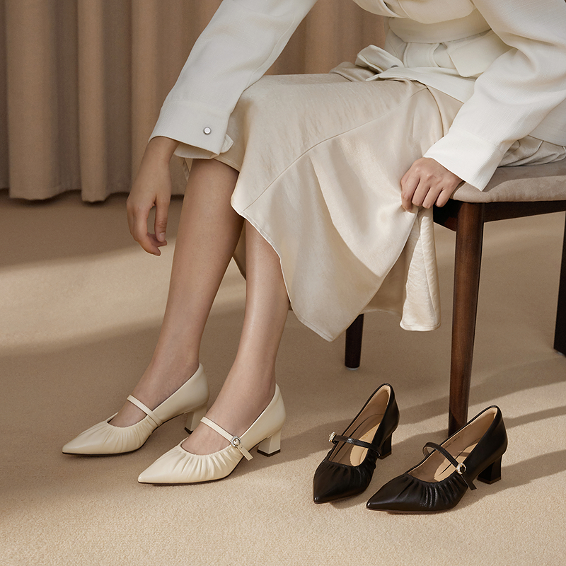 千百度CºBANNER2025新款褶皱粗高跟鞋A25184506