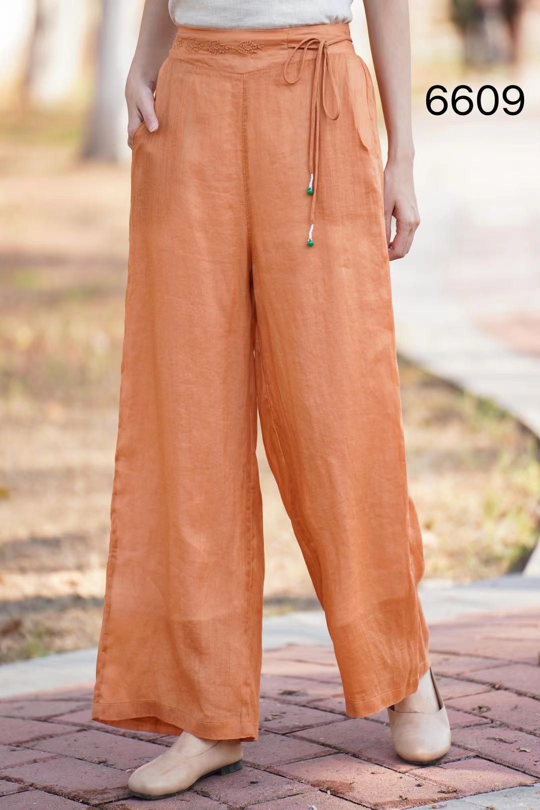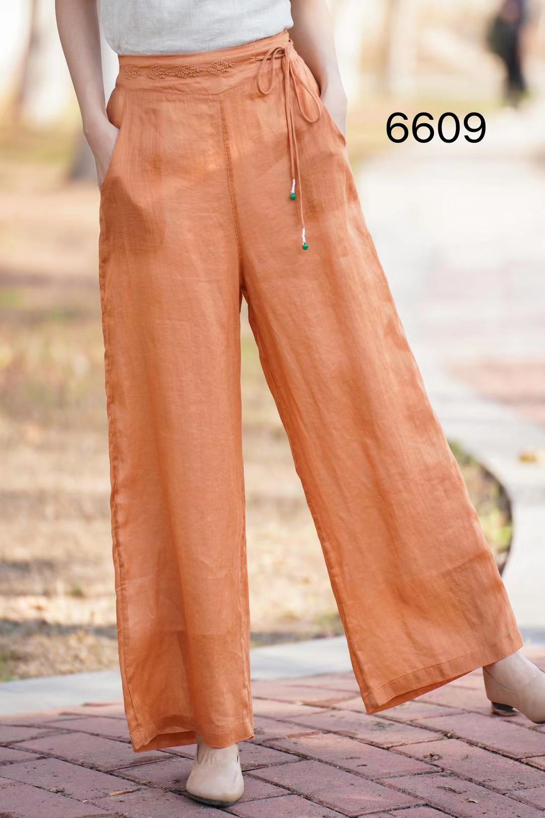 6609 浅卡 白色 m l 新款文艺范纯色苎麻松紧高腰阔腿裤 复古国风松紧腰宽松双层休闲百搭显瘦