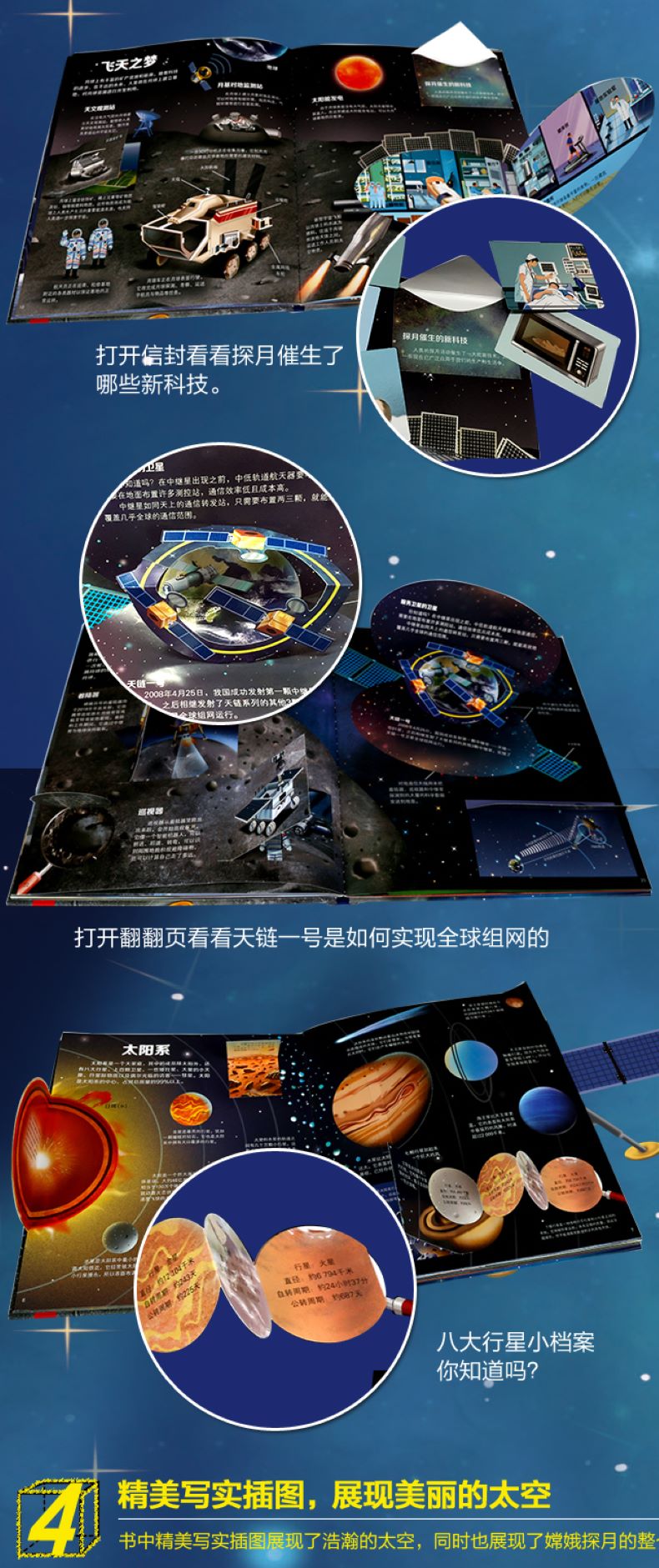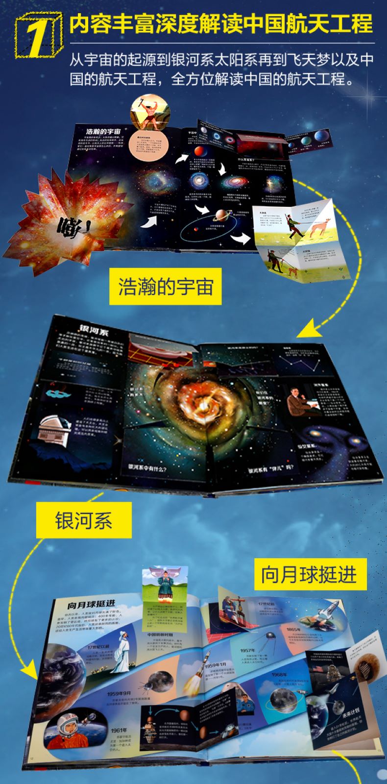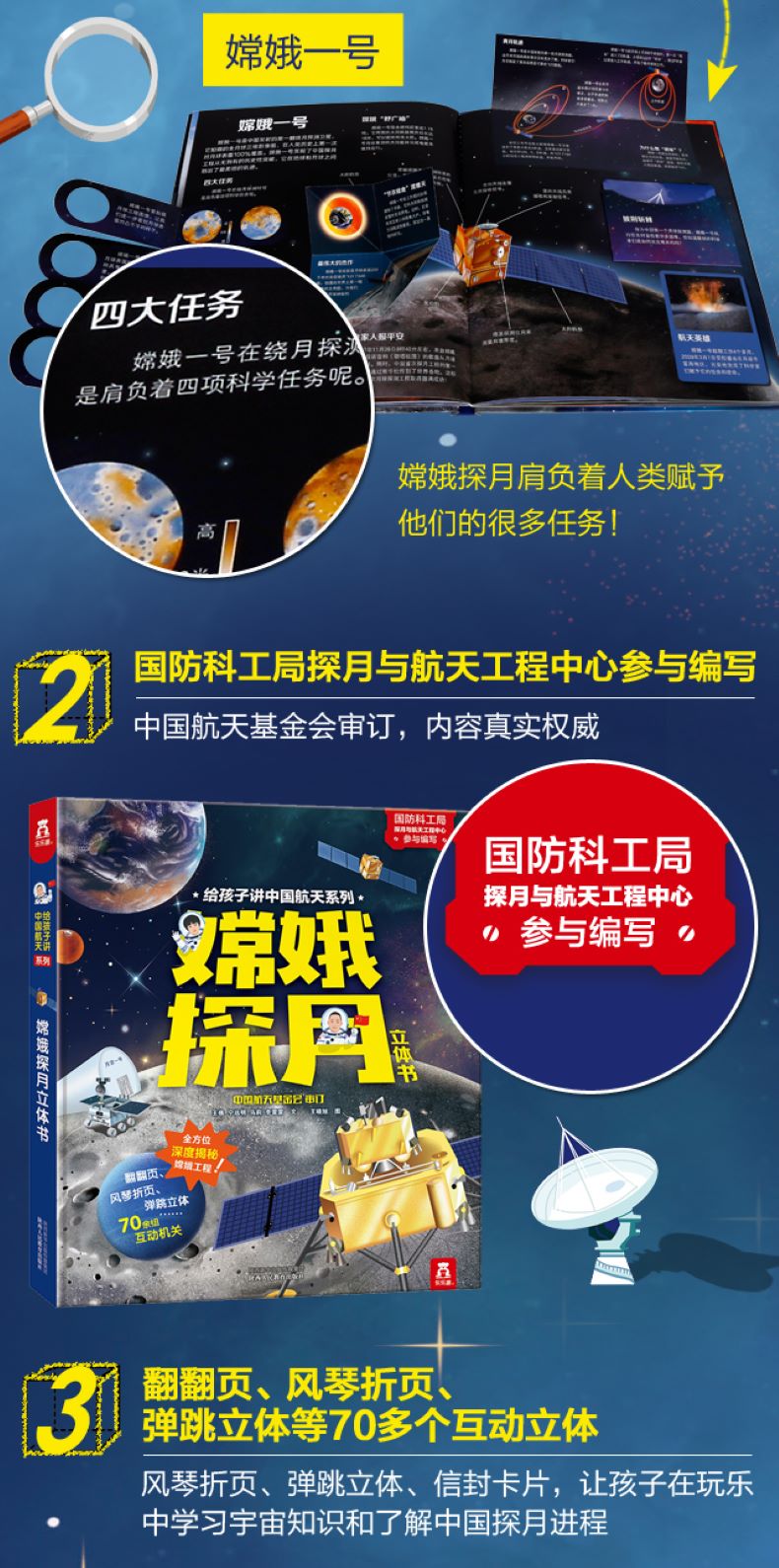 中国的探月工程——嫦娥工程是人类探月目前的重要篇章,对人类进一步了解月球做出了重要贡献。本书主要介绍宇宙太空的知识和嫦娥探月的历程,包括即将开展的嫦娥四号、嫦娥五号及火星探测任务的介绍。书中设有翻翻页、小册子、大立体等70余组互动机关,让小朋友在互动参与的过程中了解中国探月工程的曲折与精彩,更开启他们的航天梦想,未来有更多的人才加入到航天事业中来。