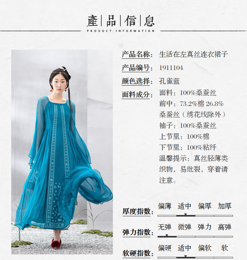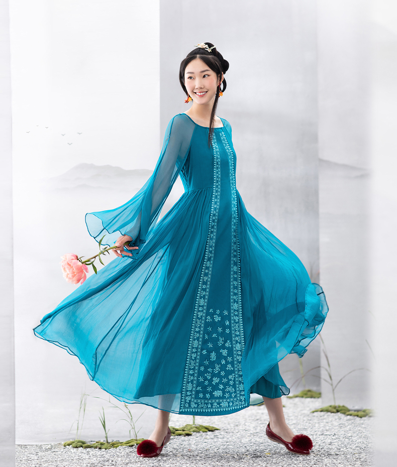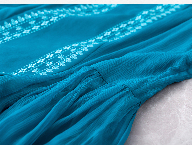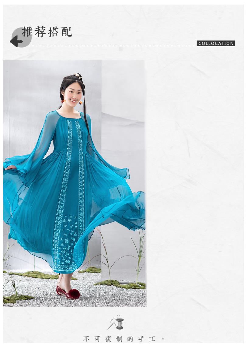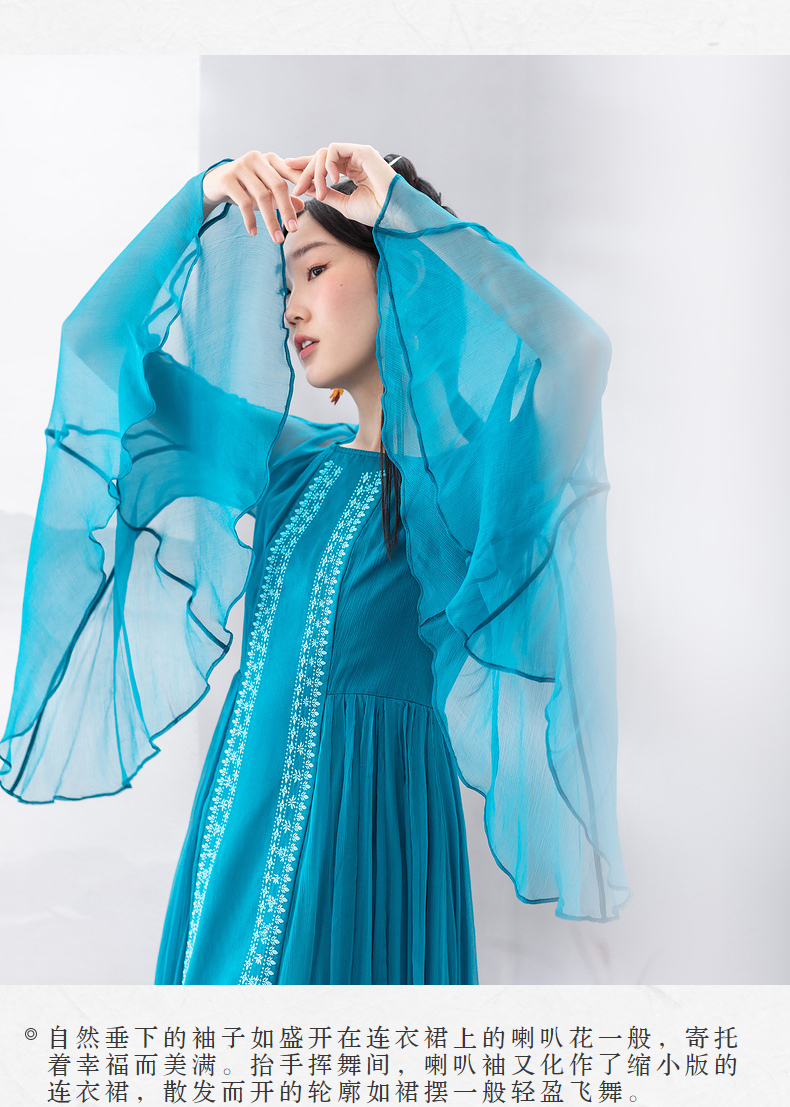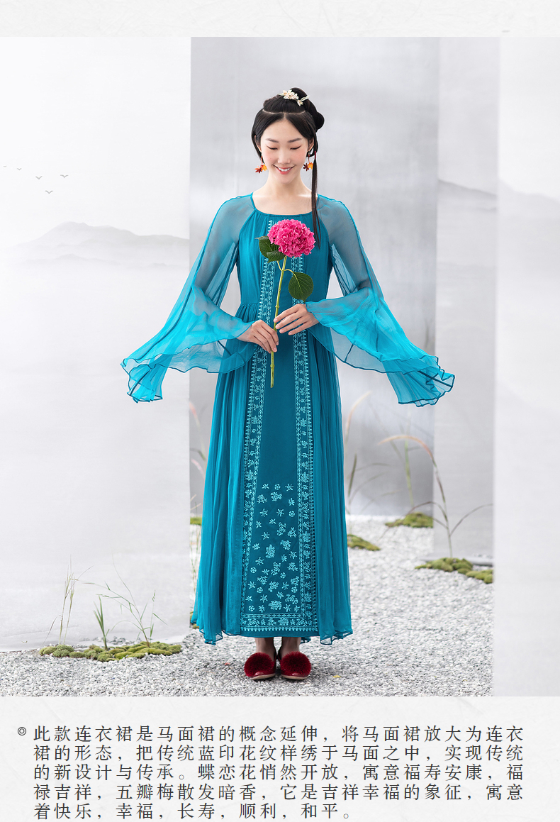 【林栖设计小店】【赵雅芝同款】【现货】生活在左孔雀蓝复古收腰显瘦真丝轻凉马面裙连衣裙气质绣花长裙 1911104