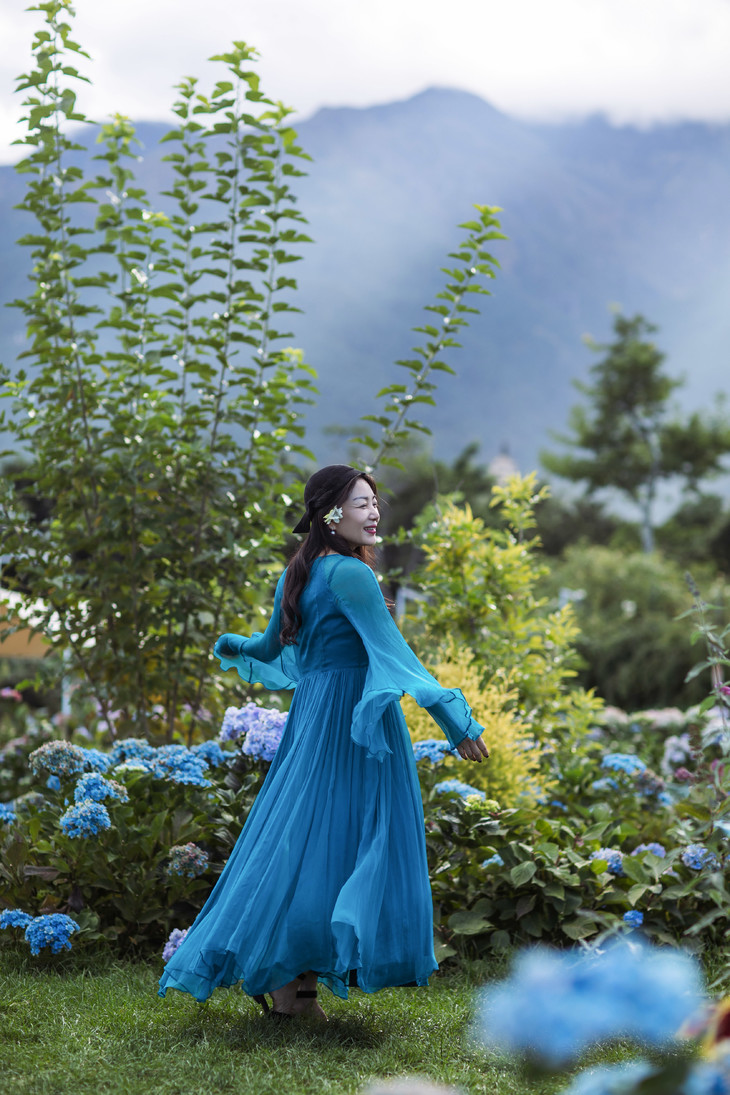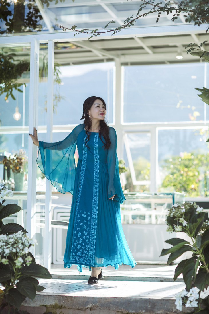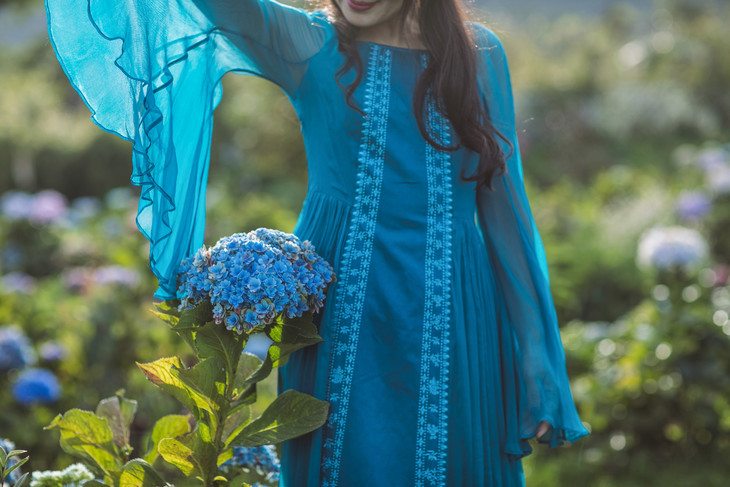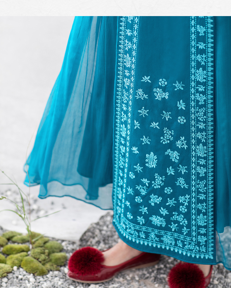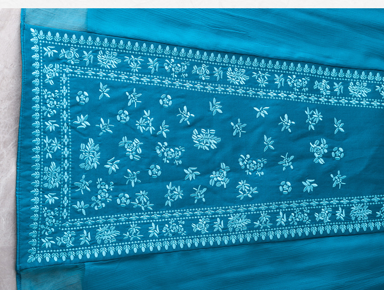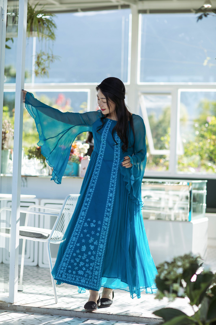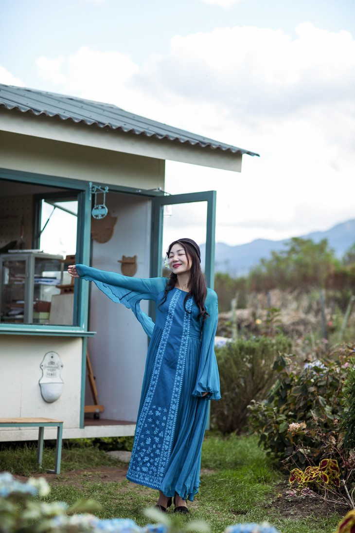 【林栖设计小店】【赵雅芝同款】【现货】生活在左孔雀蓝复古收腰显瘦真丝轻凉马面裙连衣裙气质绣花长裙 1911104