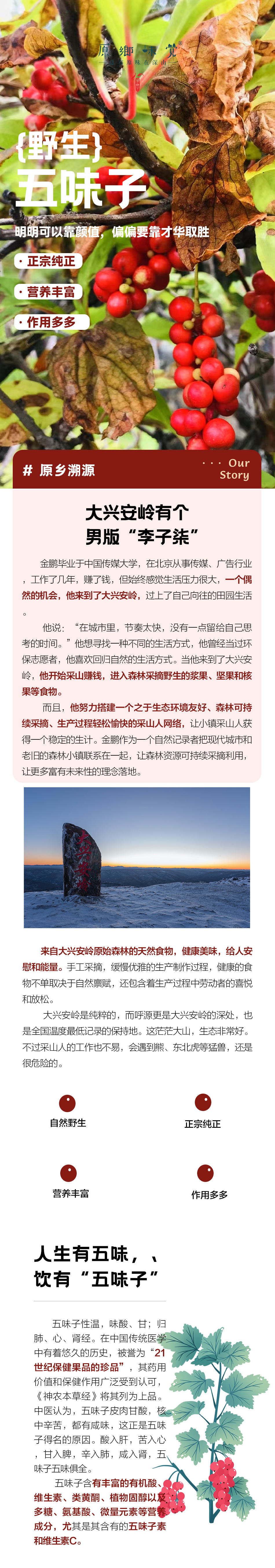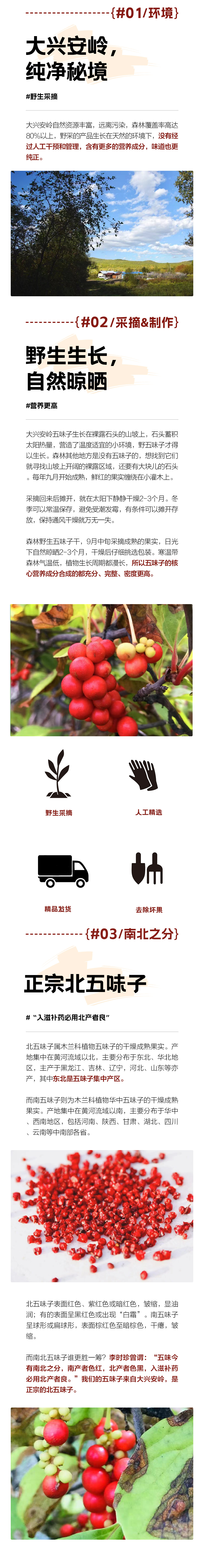 【新农人】:金鹏 【净含量】:120克 【配料】:森林野生五味子 【生产日期】:见产品标签 【保质期】:保持干燥2年 【保存方法】:通风干燥,夏季冷藏或冷冻 【生产地址】:黑龙江省大兴安岭地区呼中区呼源镇 【食用推荐】:五味子可通过多种方式食用,和蜂蜜浸泡为佳,也可泡水、煲汤等