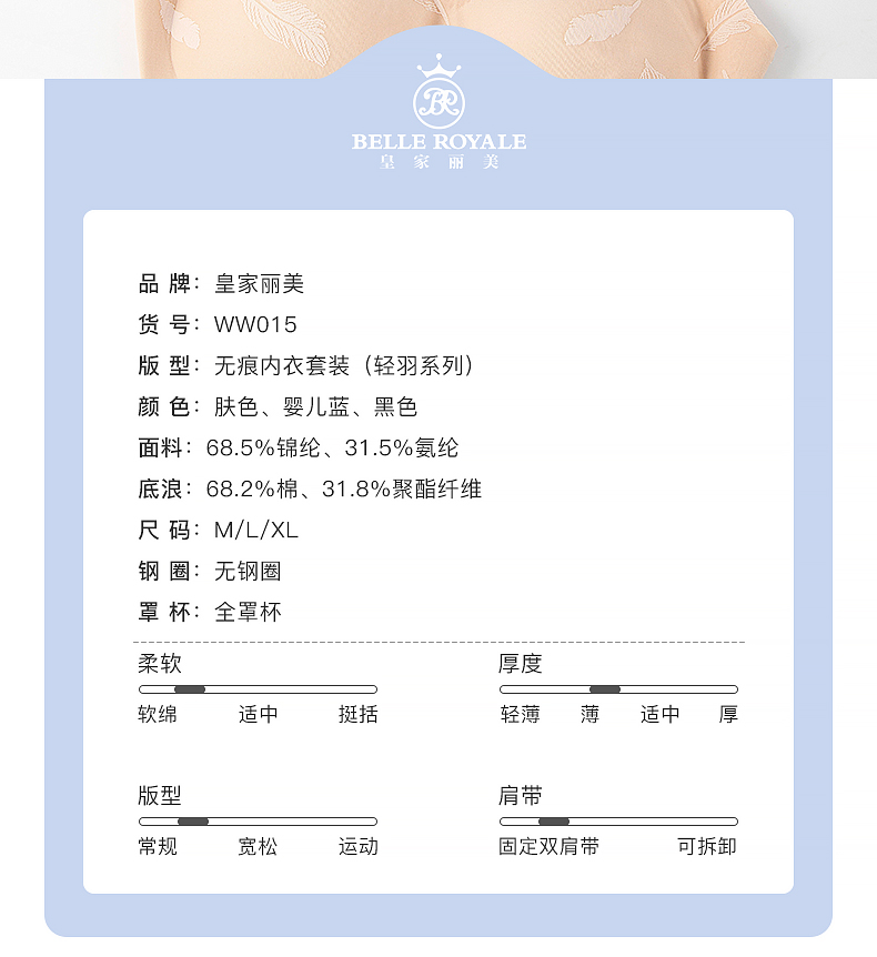 【秒杀品不退不换】皇家丽美轻羽无痕内衣收副乳无钢圈无感贴合内衣文胸套装WW015