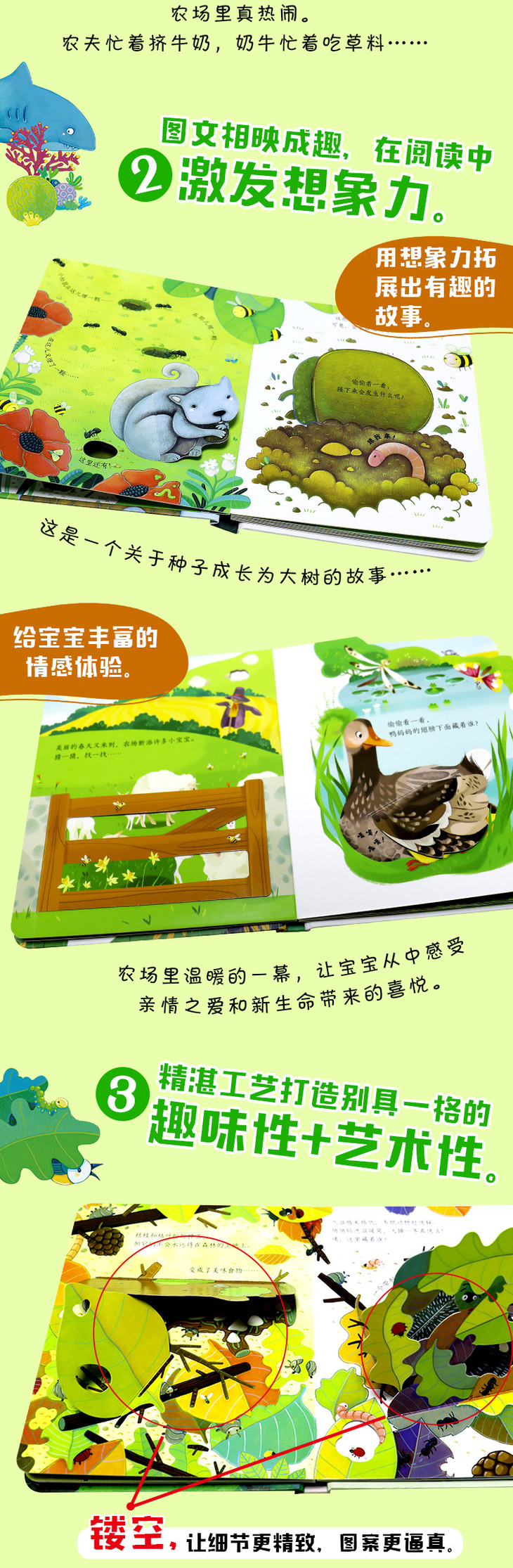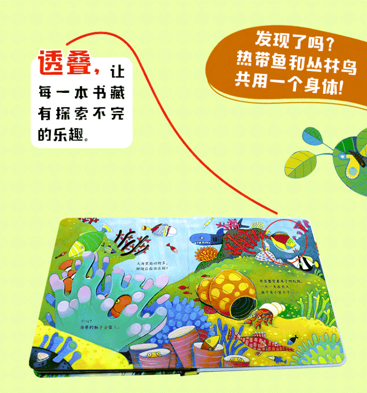 该系列有12个主题(其中《森林》《雨林》《树木》《海洋》是4本新书),内容涵盖了自然和人类生活中丰富有趣的小知识,为1—4岁的宝宝认识世界开启了一扇智慧之窗。这套书集科普性、故事性、文学性、艺术性于一体,生动活泼的图画风格和童瑶式朗朗上口的语言,让阅读成为一种愉悦的享受。书里的镂空和翻页工艺,在满足宝宝生理发展同时,打造出捉迷藏游戏一样的效果,不断激发孩子探索的欲望。