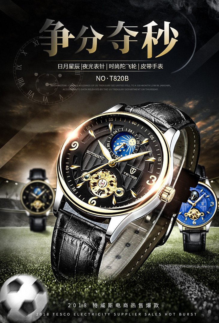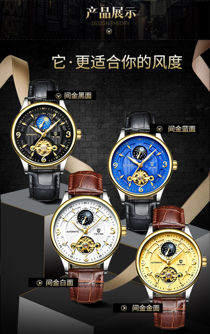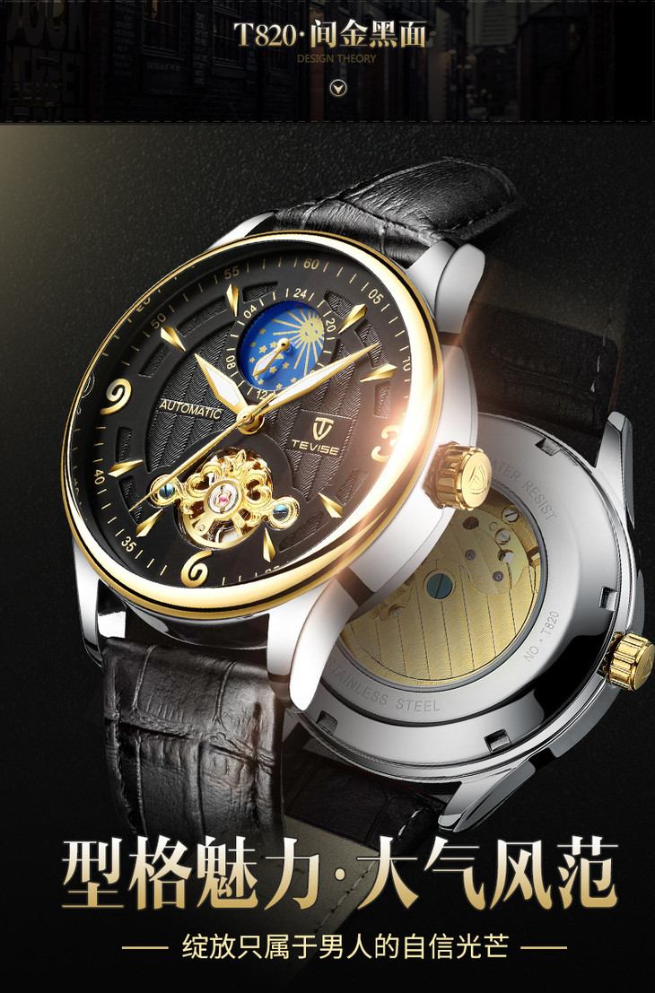 「Tevise特威斯 镂空全自动机械表」月相陀飞轮男士防水父亲节礼物手表