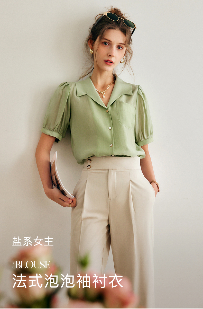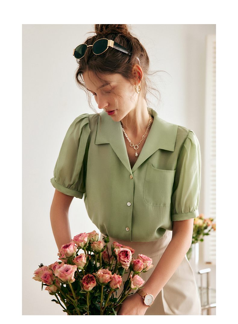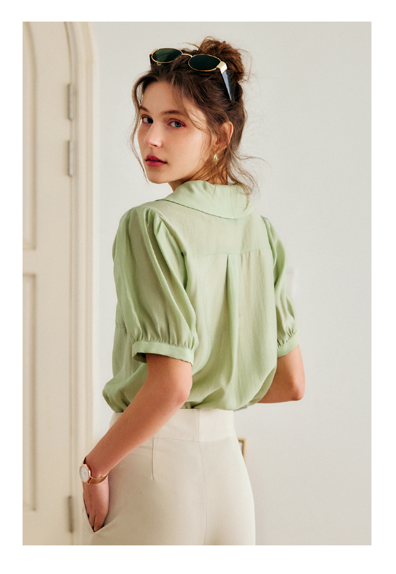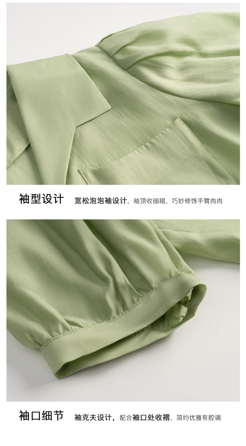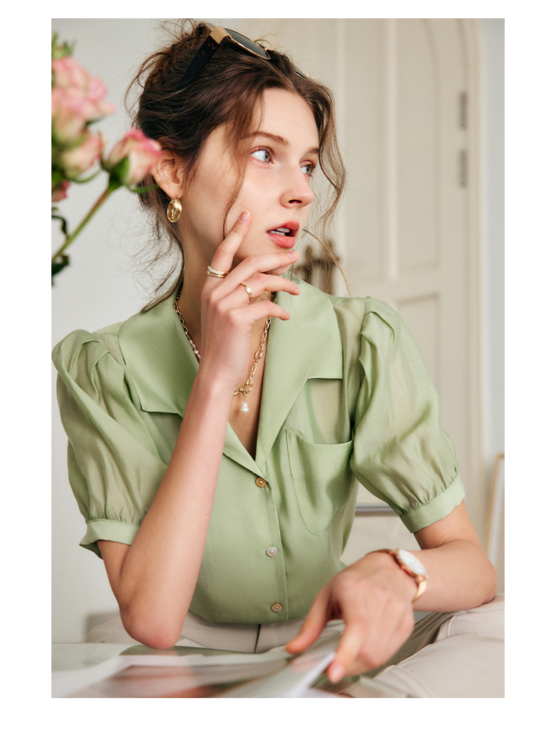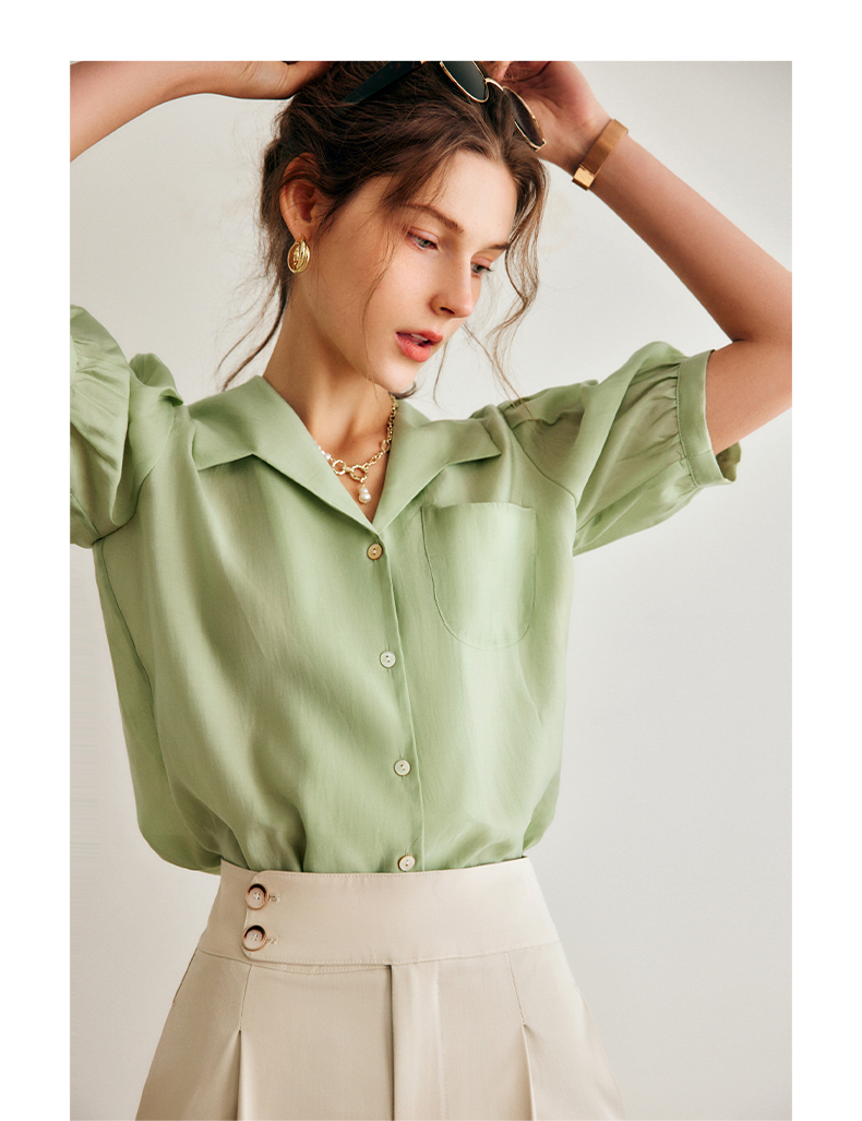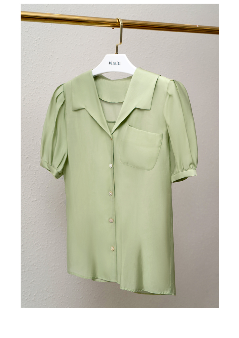 OLrain法式高级穿搭绿色天丝衬衫女夏季2022年新款泡泡袖薄款衬衣