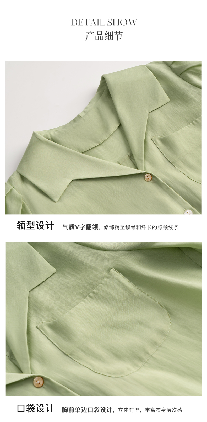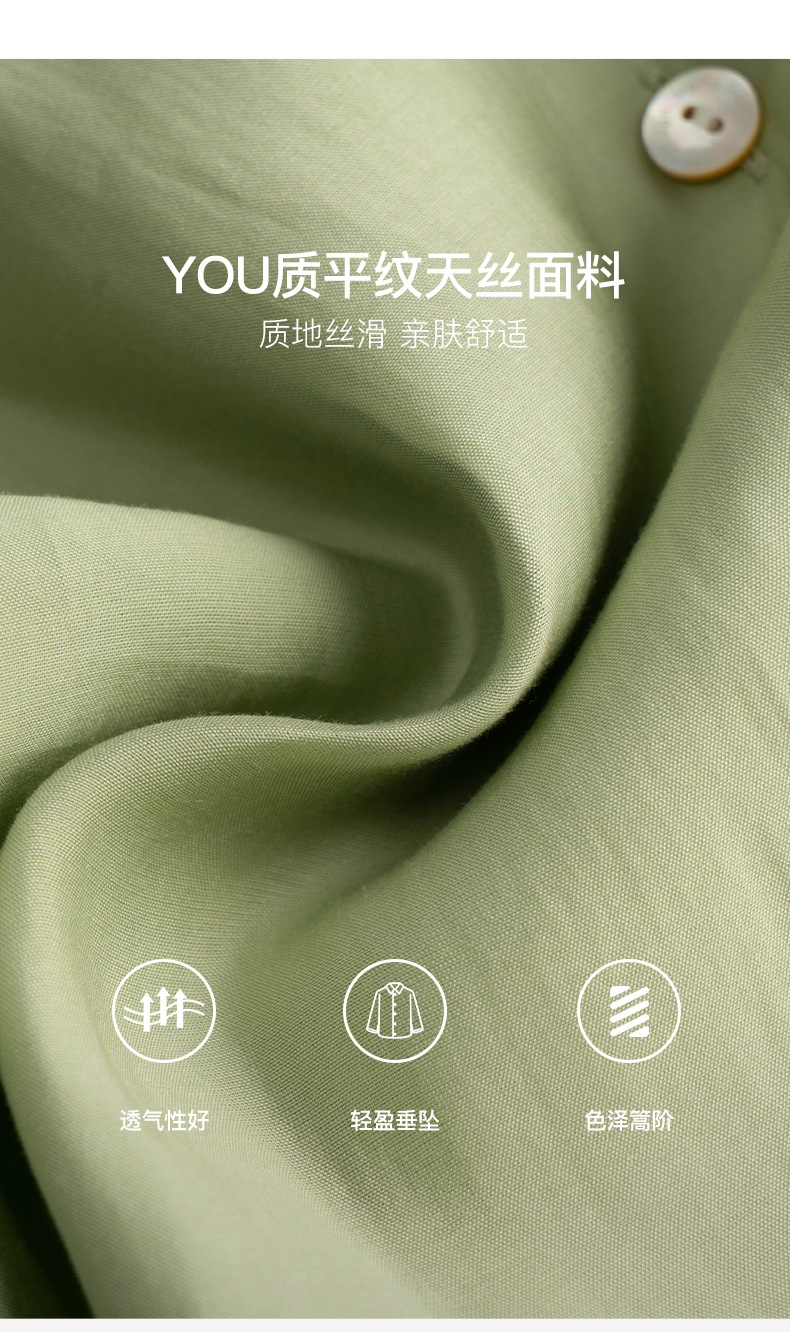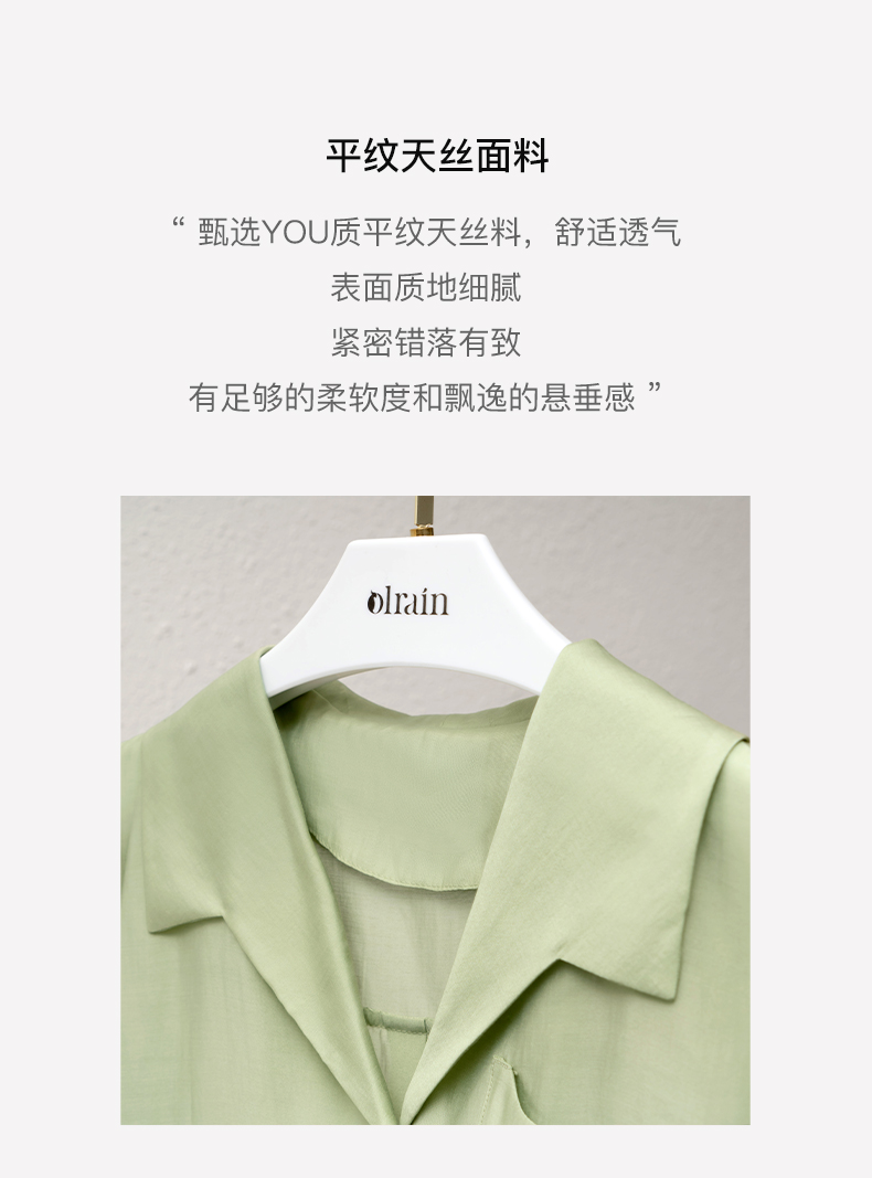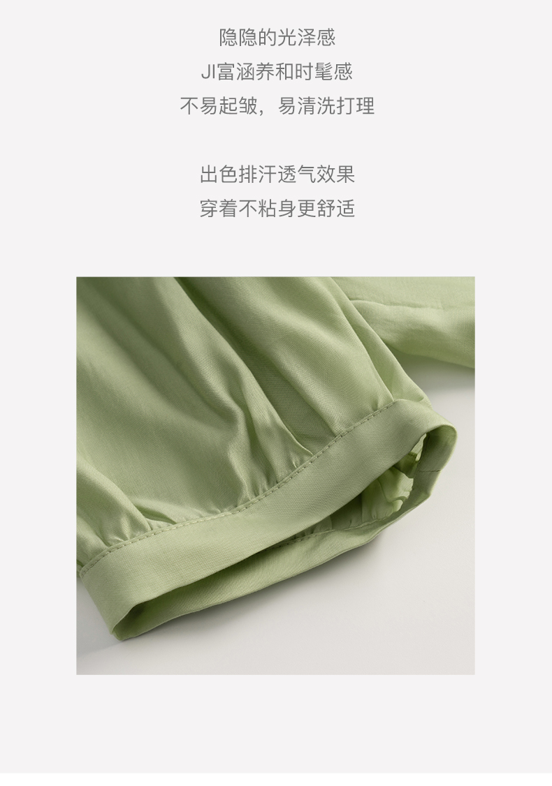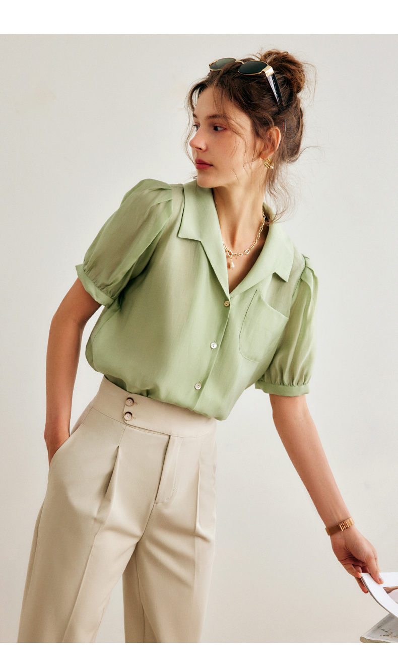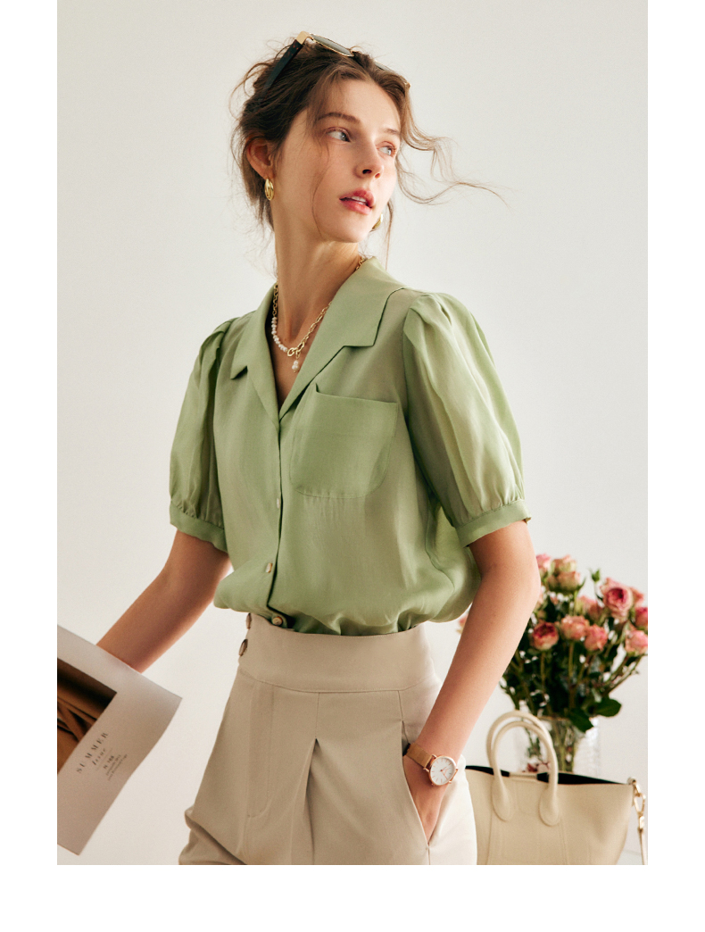 OLrain法式高级穿搭绿色天丝衬衫女夏季2022年新款泡泡袖薄款衬衣