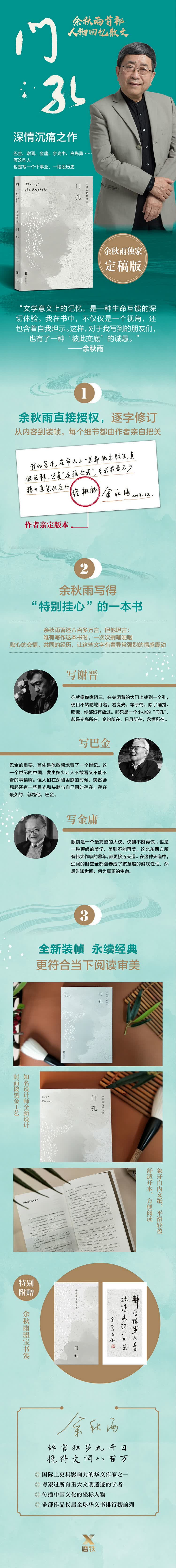 《门孔》是余秋雨先生的一部人物回忆散文集,描述了他与谢晋、巴金、黄佐临、金庸、饶宗颐、白先勇、林怀民、余光中、章培恒、陆谷孙、王元化等文化大家的交往。因为作者与这些人有着贴心的交情、共同的经历,读者得以透过“门孔”看到这些人在公众视野之外的一面,受到的情感震动也异常强烈。因为作者对友人的回忆包含着自我坦示,当他谈到自己的经历、和亲人的关系时,笔下的文字似乎就变成了向友人交底的一封信。于是,文学意义上的记忆,成为一种生命互馈的深切体验,而读者亦参与其中。