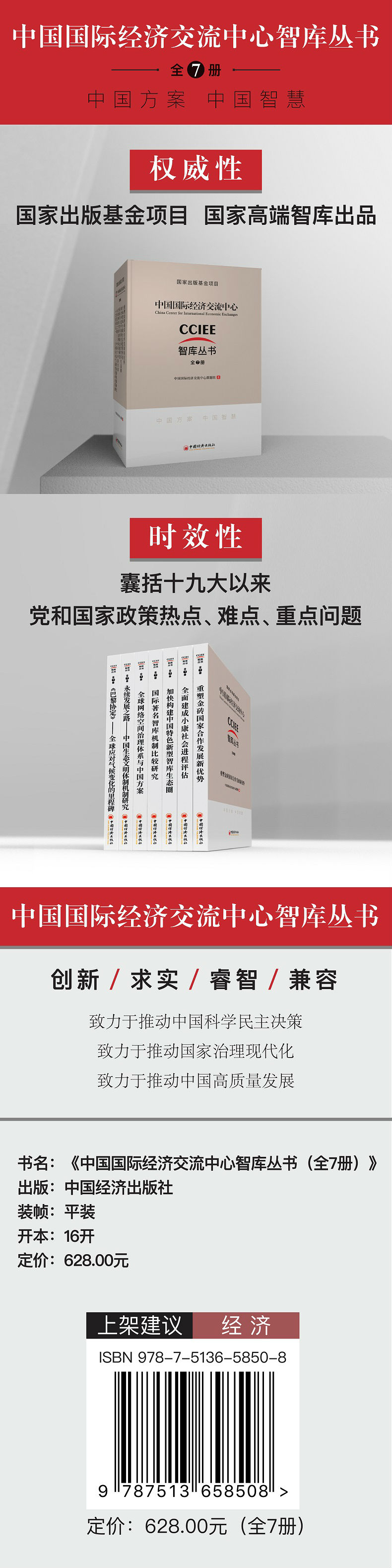 “中国国际经济交流中心智库丛书”共计7册,范围涉及政治、经济、社会、文化、生态、外交等领域,既有发展问题,又有改革问题,既有国内问题,又有国际问题。可以说覆盖面广,是具有一定创新性的思想产品。这套丛书,内容详实,结构合理,成果丰富,具有较强的战略性、系统性、针对性和实用性,为政府和企业提供了重要的决策参考作用,具有较高的应用价值和研究参考价值。丛书作者均为国家高端智库资深经济领域专家,相关研究持续性强,基础扎实,调研深入,数据充分,所生产的成果很多都形成了社会共识并取得较好的社会效益,获得国家领导重要批示,并在实践中得以应用和论证,具有较高的出版价值。凭借上述实力,这套高质量的研究成果成功获得国家出版基金项目资助。