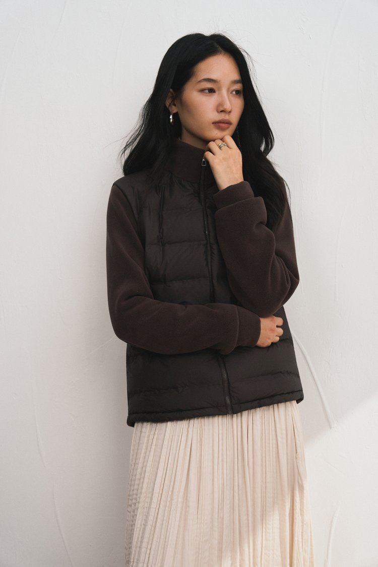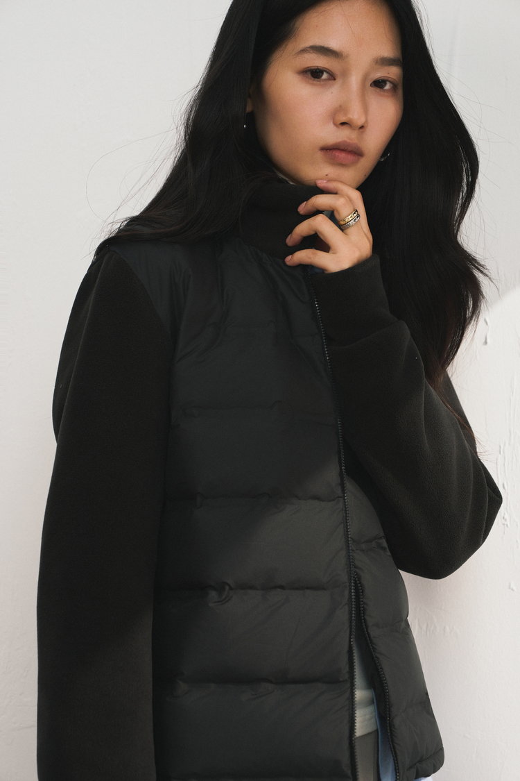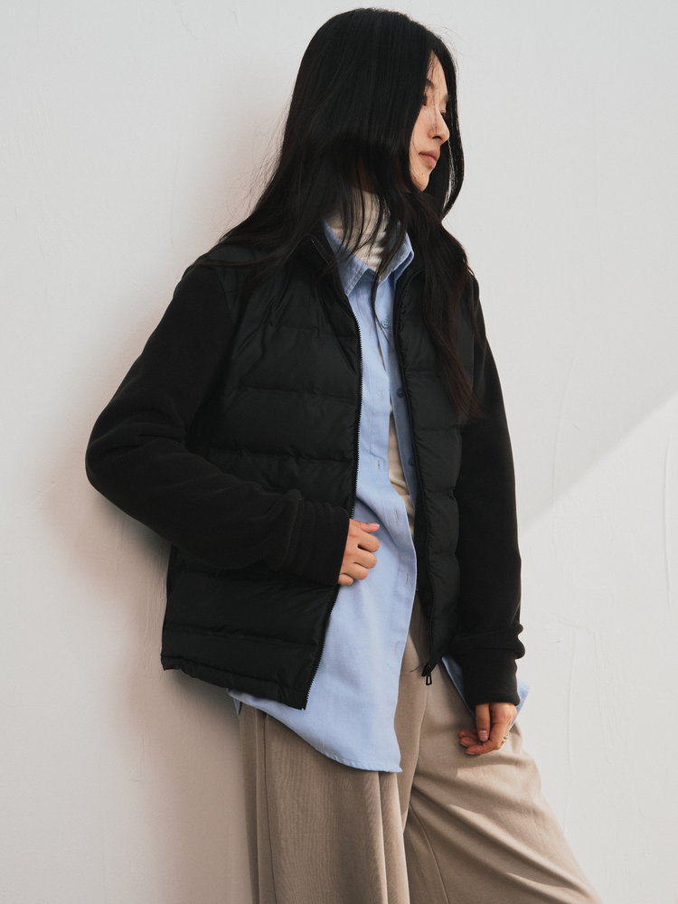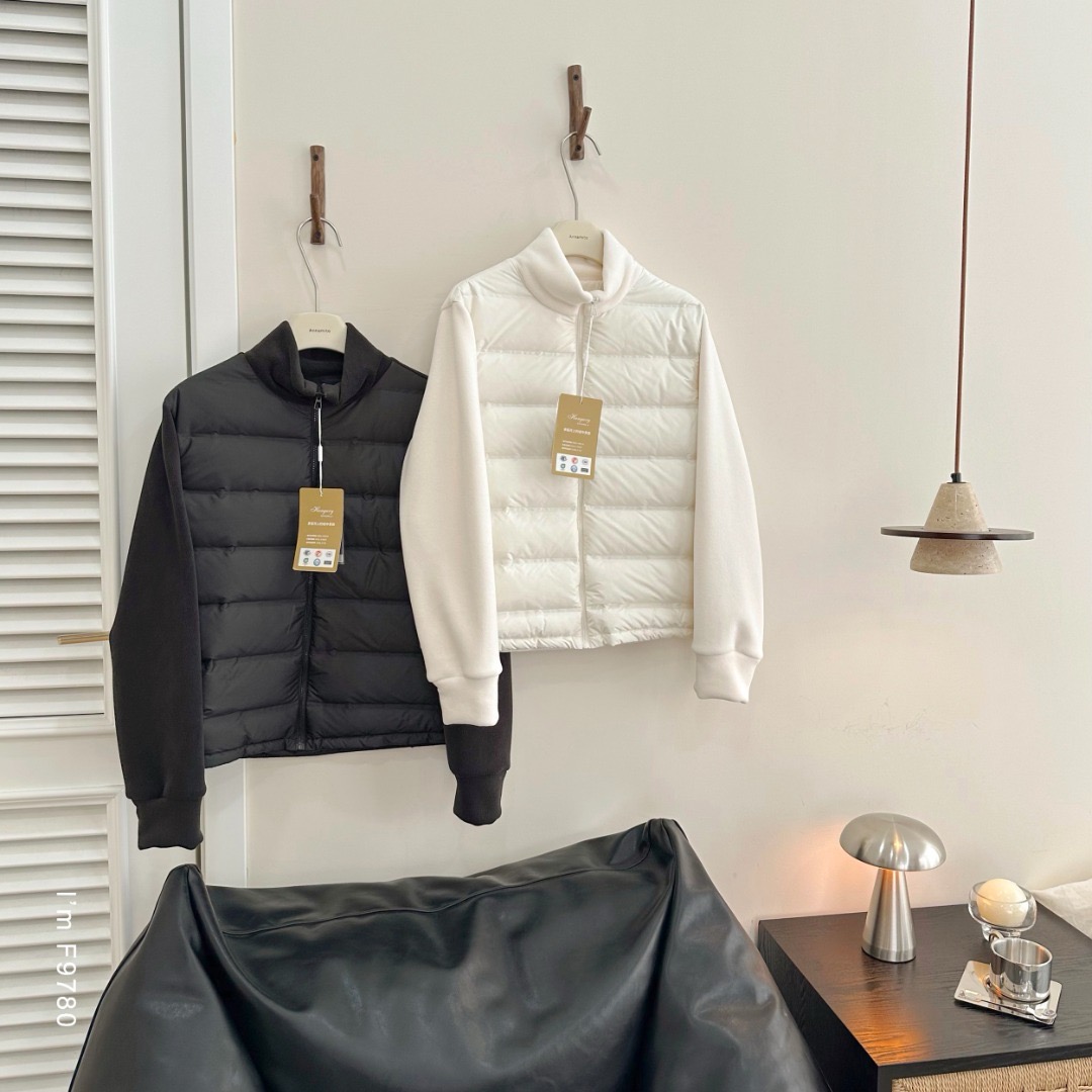 轻暖百搭的假两件拼接设计羽绒服,来自柳桥集团的甄源系列——匈牙利90%白鸭绒,. 生长在北纬45度的多瑙河黄金羽绒核心地带的白鸭。