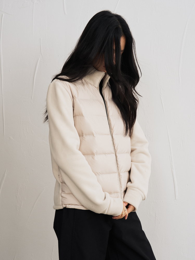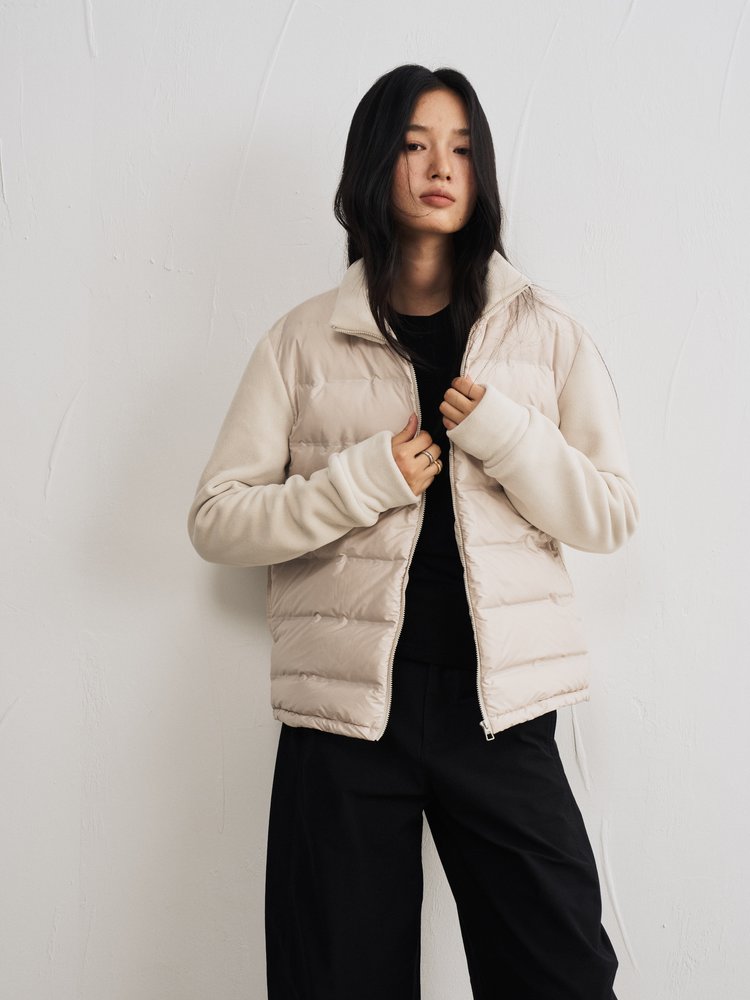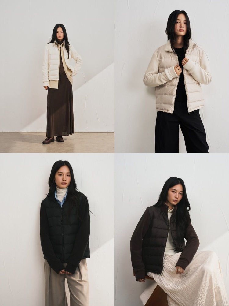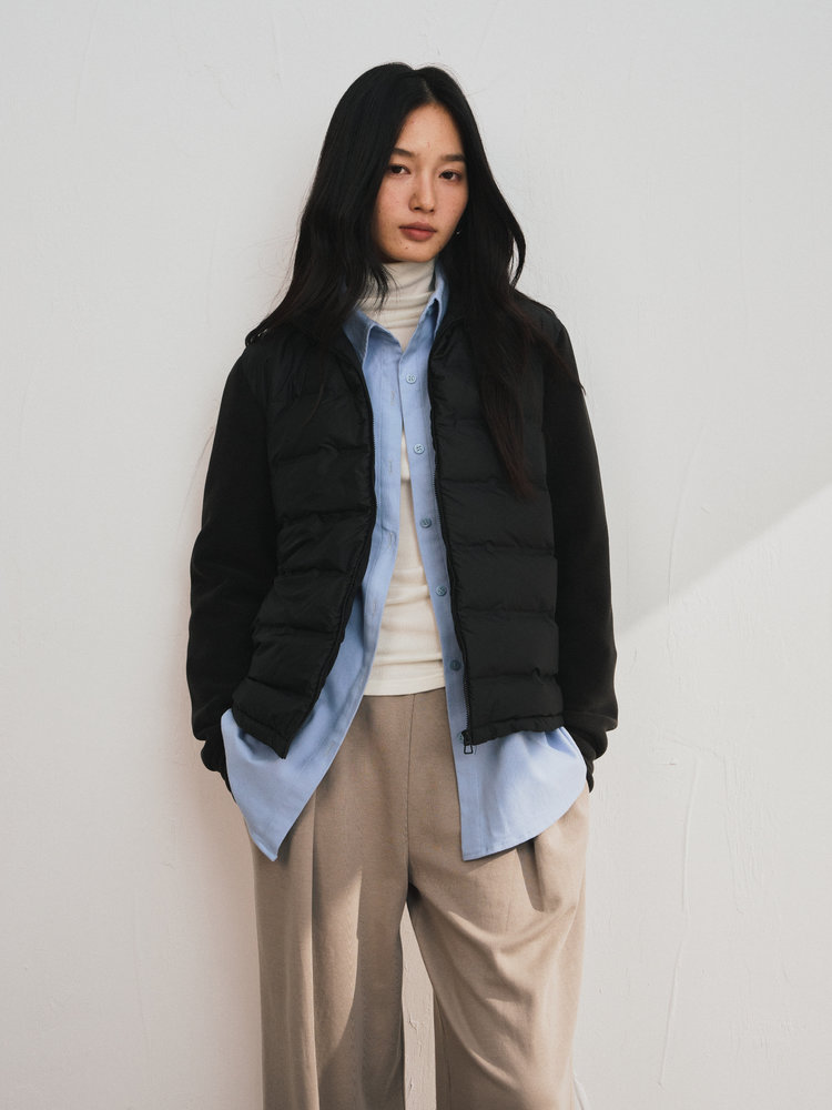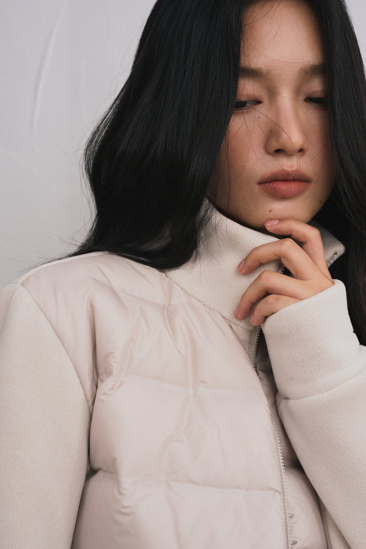 轻暖百搭的假两件拼接设计羽绒服,来自柳桥集团的甄源系列——匈牙利90%白鸭绒,. 生长在北纬45度的多瑙河黄金羽绒核心地带的白鸭。