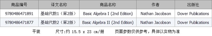 本书及其配套著作是一位在耶鲁任教20年的代数专家的著作。内森·雅各布森的书具有概念和理论导向,除了作为课堂文本的价值外,它们还是有价值的参考资料。
