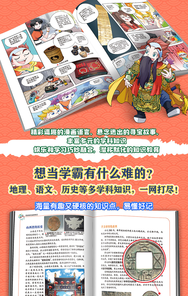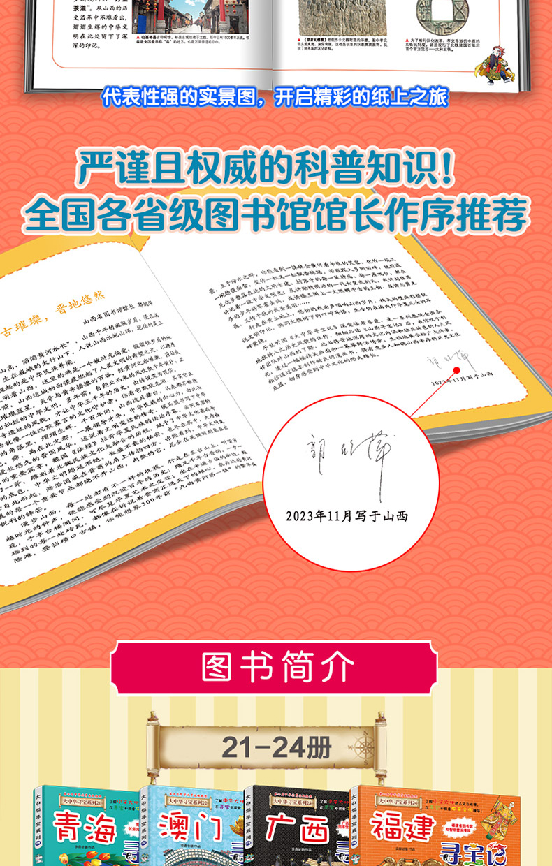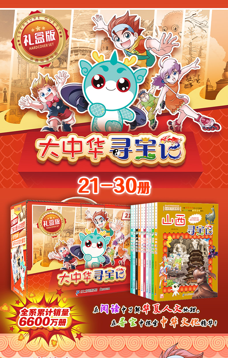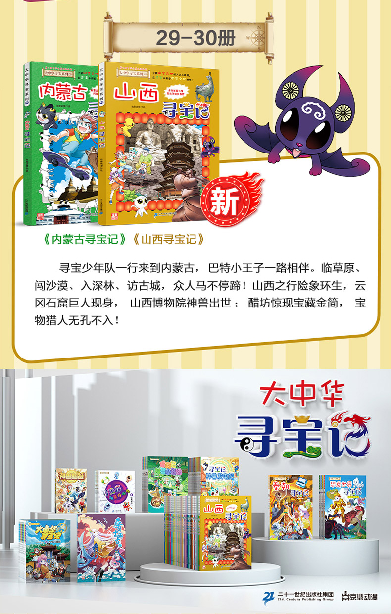 “大中华寻宝系列”漫画版图书共34册,以23个省、5个自治区、4个直辖市、2个特别行政区为创作背景,讲述一群机敏睿智的少年,联合千年超能神兽,遍游祖国各地,展开奇妙玄幻的寻宝故事。丛书以独特的漫画元素和创新的故事语言,悬念叠出的情节和匠心独运的编创,将神州大地的地理风貌、历史遗迹、文化艺术、物产资源、民族风俗等内容巧妙融合,为读者开启一场场足尖上的中国之旅,是中华文化别开生面的呈现。大中华寻宝记21-30册分册书名为:《青海寻宝记》《澳门寻宝记》《广西寻宝记》《福建寻宝记》《河北寻宝记》《新疆寻宝记》《黑龙江寻宝记》《内蒙古寻宝记》《山西寻宝记》 。