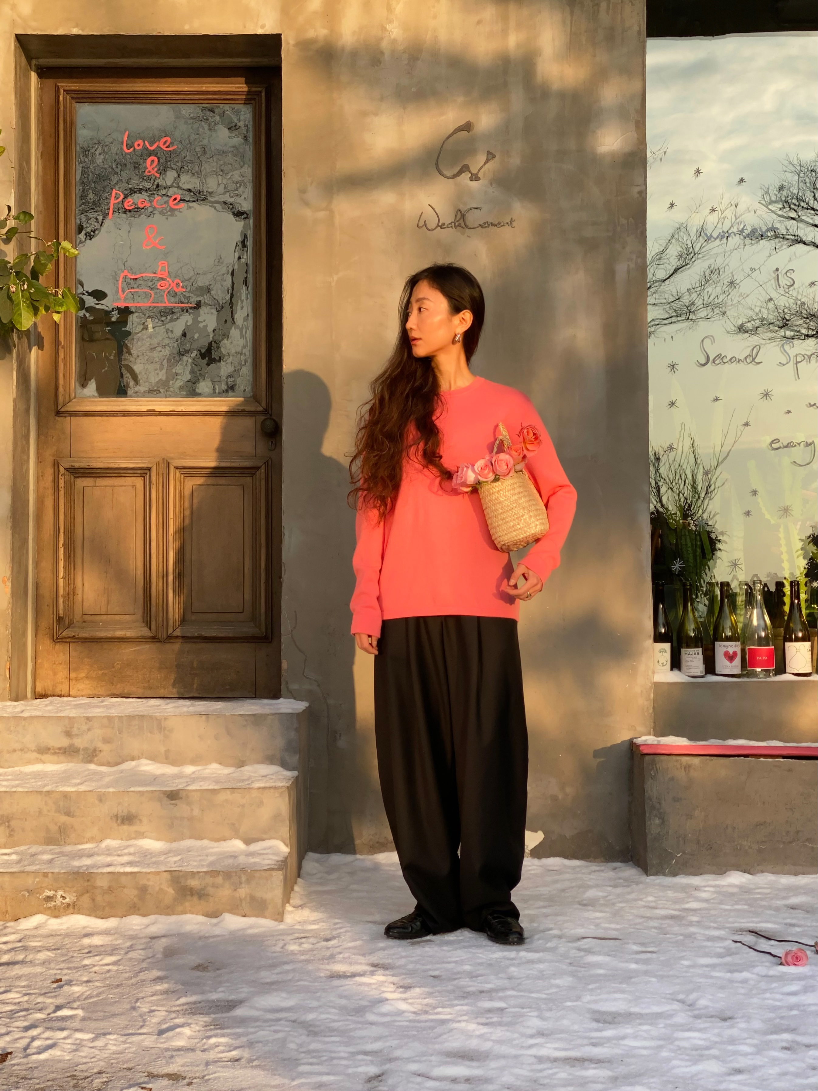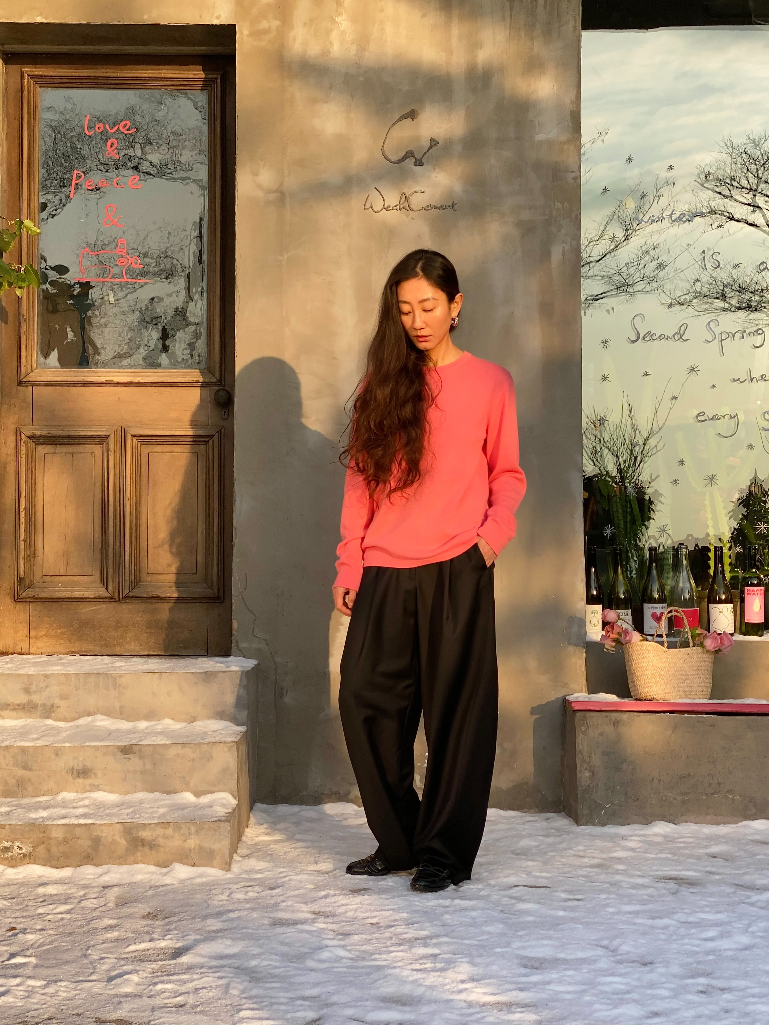 袖口与底边使用宽握边替代千篇一律的螺纹收口,强调其极简初衷。利落的版型和娇柔的羊绒形成冲撞,是软水泥的特有风格。
