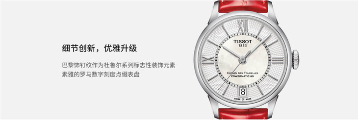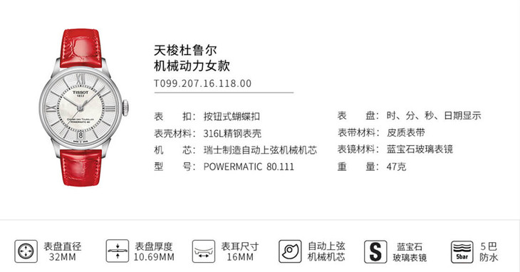 | 防水 | 50 m | 表带 | 红色真皮表带 按钮式蝴蝶扣 |