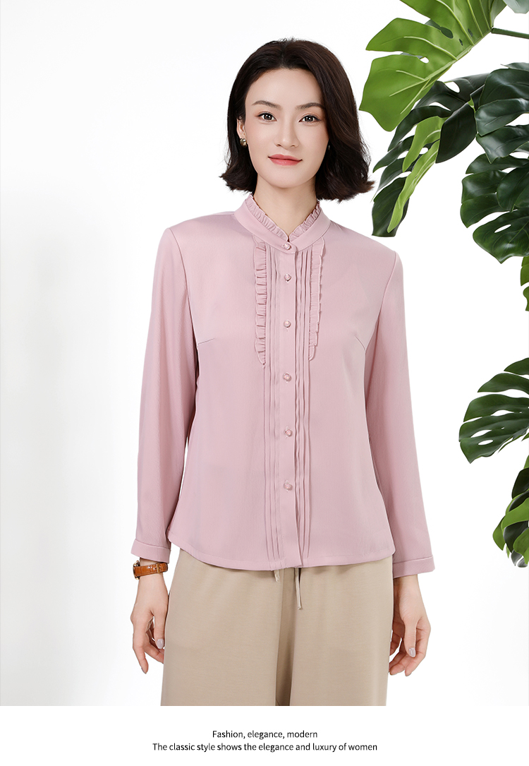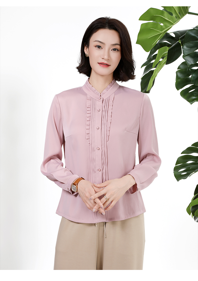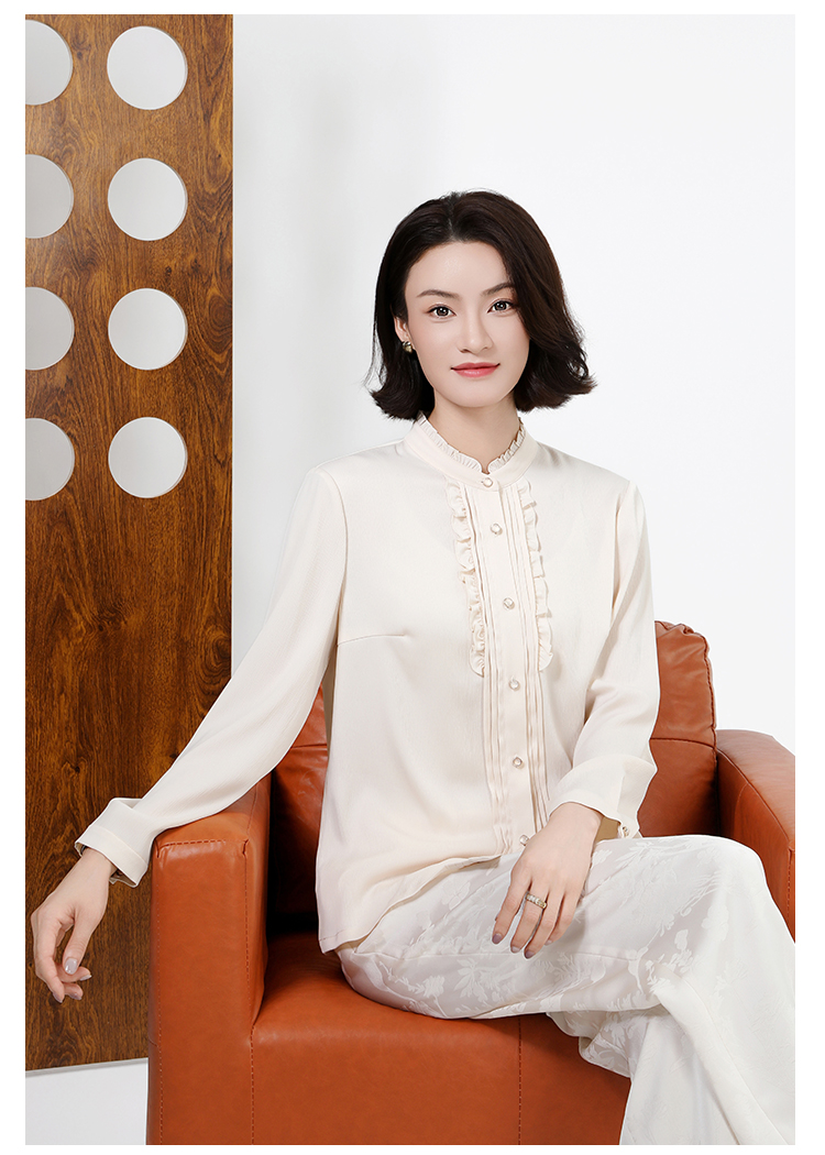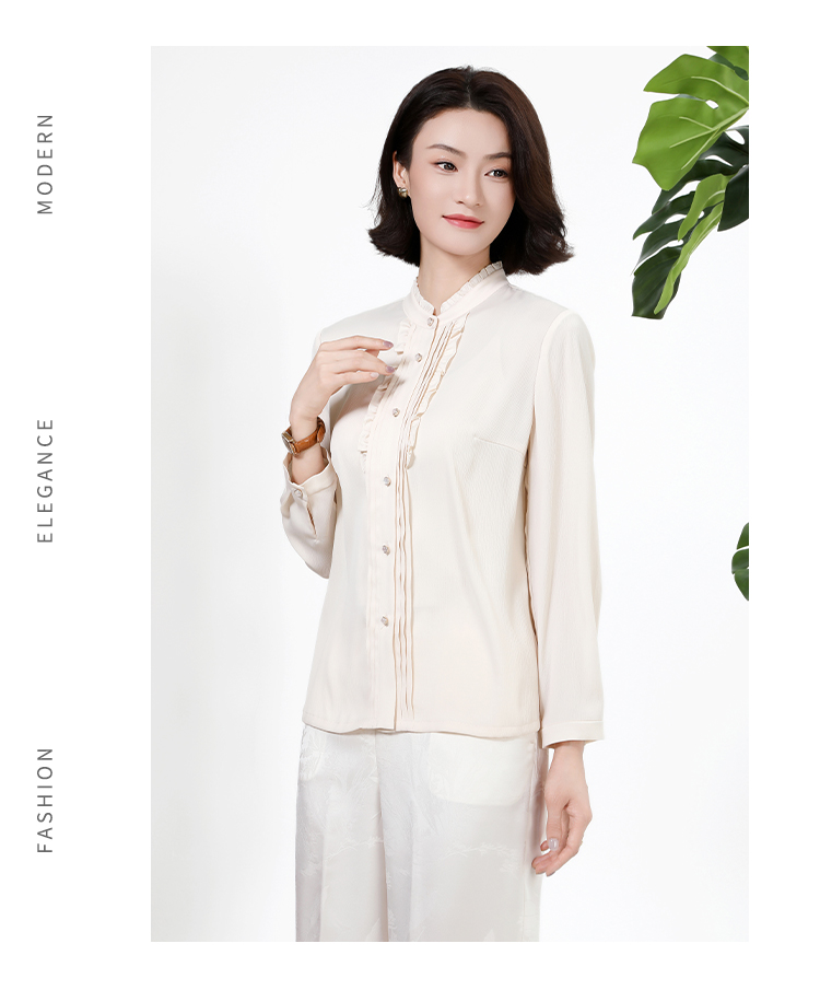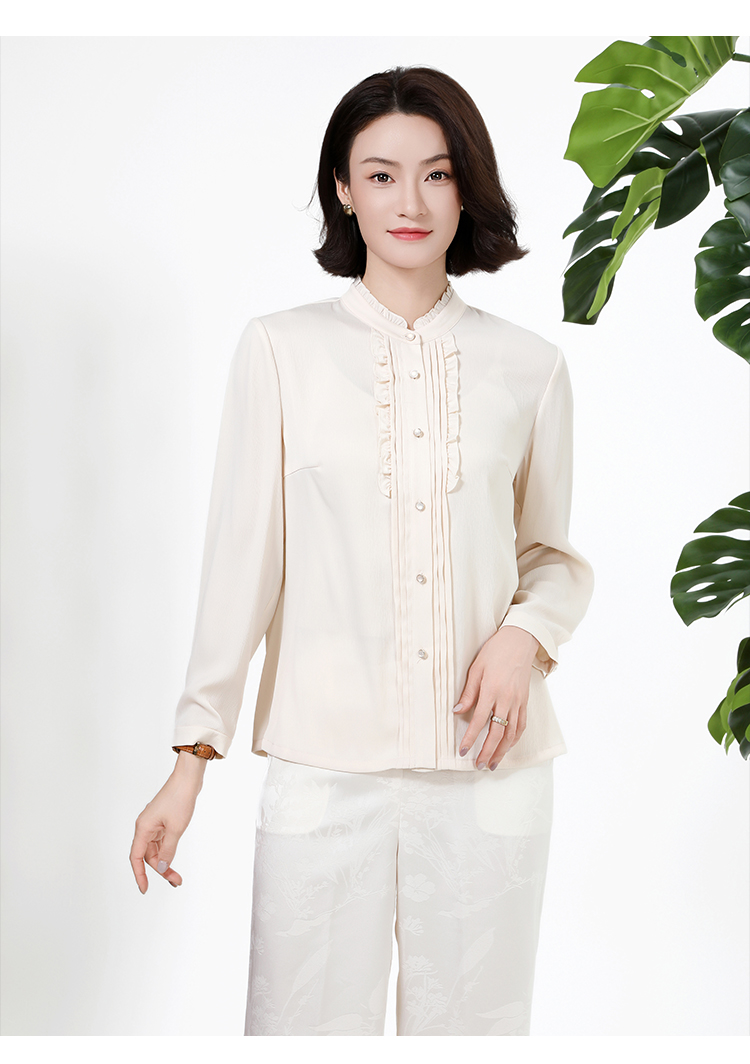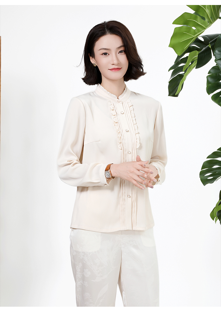 佐尔美秋上新百搭轻熟风立领褶皱法式木耳边门襟衬衣女M51CC08