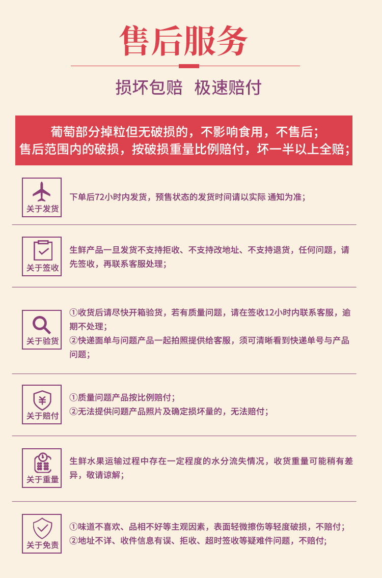 3、葡萄运输过程中少量掉粒属于正常现象,未破损不影响食用,不属于售后范围;