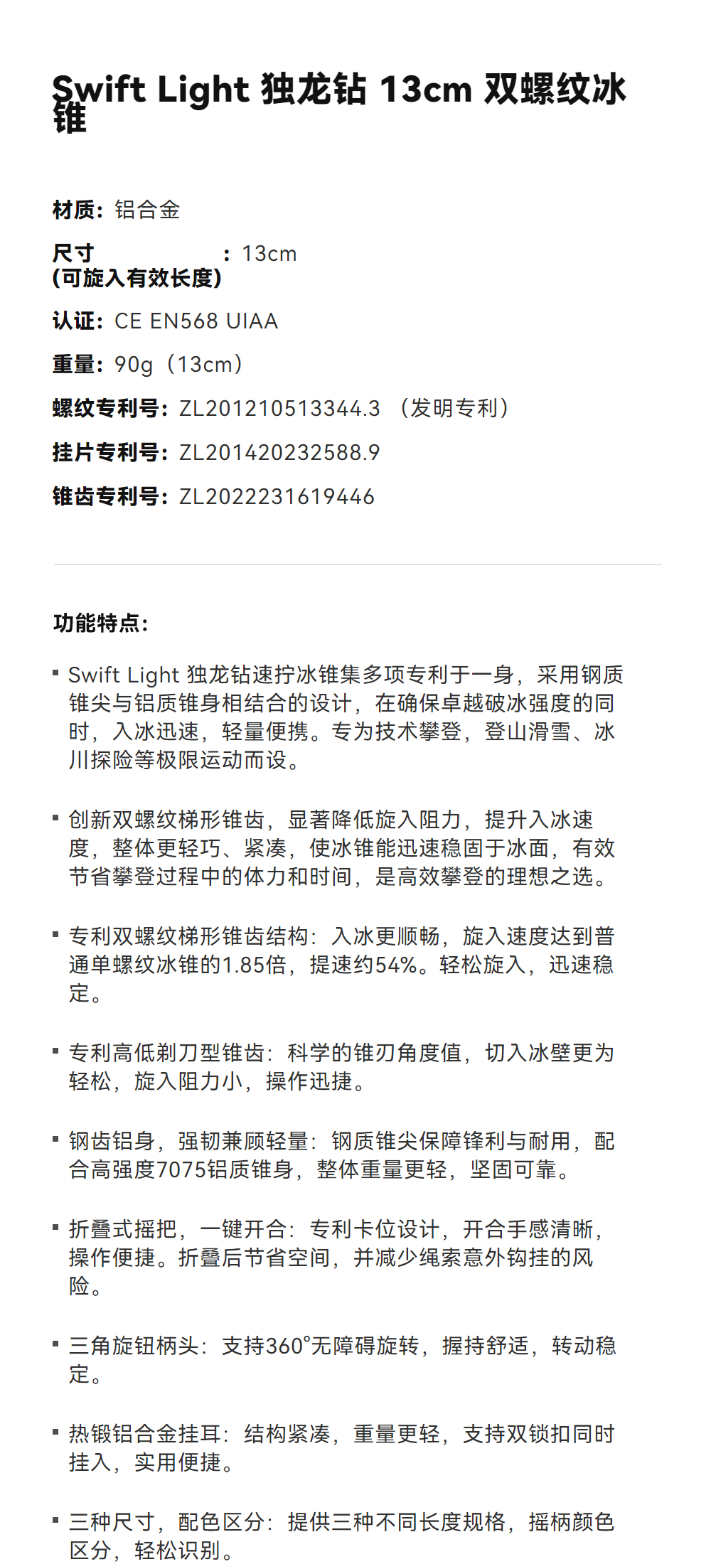 KAILAS凯乐石 Swift Light 独龙钻 13cm 双螺纹冰锥 EI611A