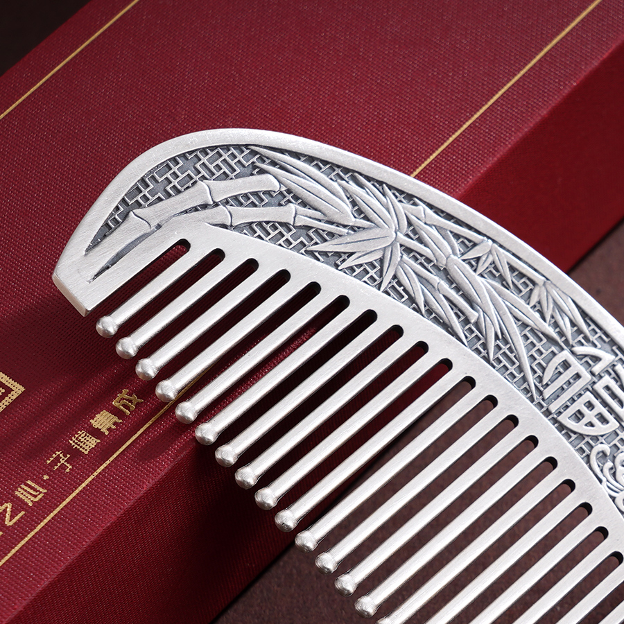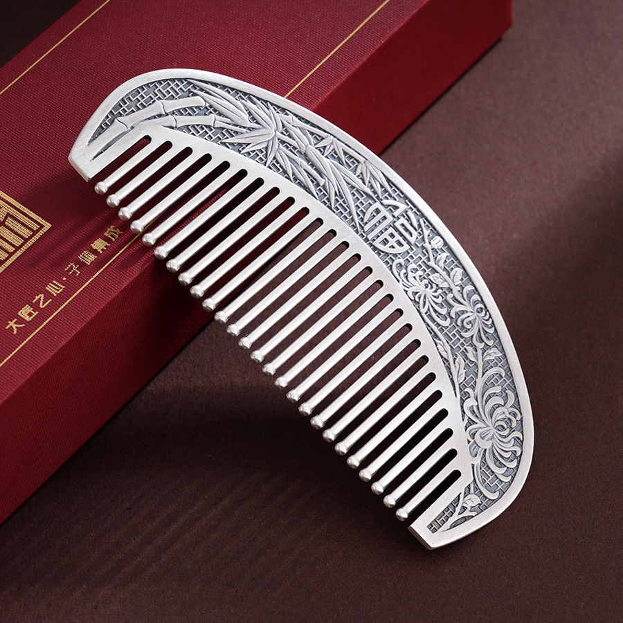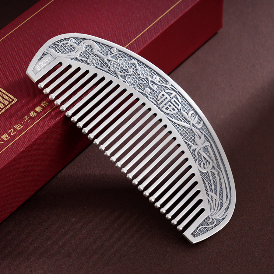【寓意】:银梳以梅兰竹菊为灵感,浮雕工艺精细雕琢。融“四君子”品格与姿质于一体,寓意高洁坚贞,更显飘逸清雅。既是日常用品,亦是艺术品,送礼自用两相宜。