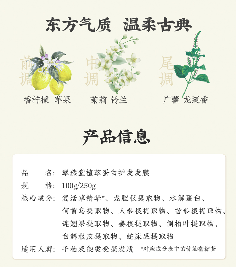 翠然堂植萃蛋白护发发膜250g,买即送复活草发膜1瓶100g+2片护发精油小样