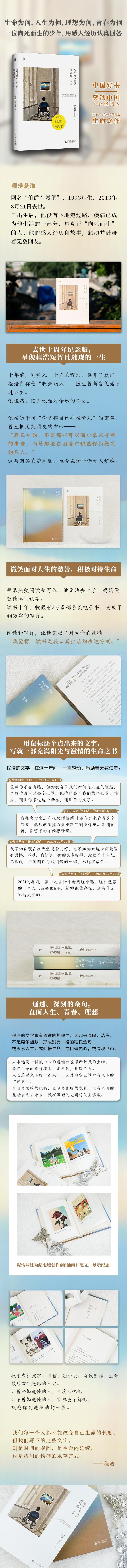 十年前,刚步入二十岁的程浩,离开了我们。程浩自称是“职业病人”,出生后便没下地走过路,医生曾断言他活不过五岁。收到过的病危通知单厚厚一沓,被妈妈用十厘米长的钉子钉在墙上。他坦然、阳光地面对命运的不公。他在知乎对“你觉得自己牛在哪儿”的回答,曾直抵无数网友的内心——“真正牛的,不是那些可以随口拿来夸耀的事迹,而是那些在困境中依然保持微笑的凡人。”这条回答的赞同数,至今在知乎仍无人超越。程浩热爱阅读和写作。他无法去上学,妈妈便教他读书认字。读书十年,他建立起了强大的精神世界。对于写作,他曾说:“我们每一个人都不能改变自己生命的长度,但我们写下的这些文字,则是时间的凝固,是生命的延续,也是我们的精神专享的永存方式。”十年后,我们将程浩这位把活着当作一种事业的“生命歌者”短暂且璀璨的一生,集中呈现出来,有专栏文字,有知乎问答,有书信和短小说、诗歌创作,也有记录生命最后四年光影的日记,让曾经知道他的......