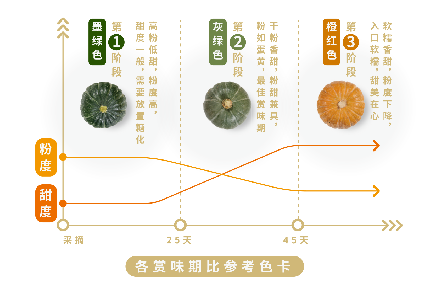 ②第二阶段:颜色由墨绿色转为灰色时,进入赏味期,开始上市销售,这时它的口感上粉度和甜度兼具,有独特的香气,特别是在由灰色再转橙色的初期,是它的最佳赏味期,甜度很高的同时还能保持粉度;