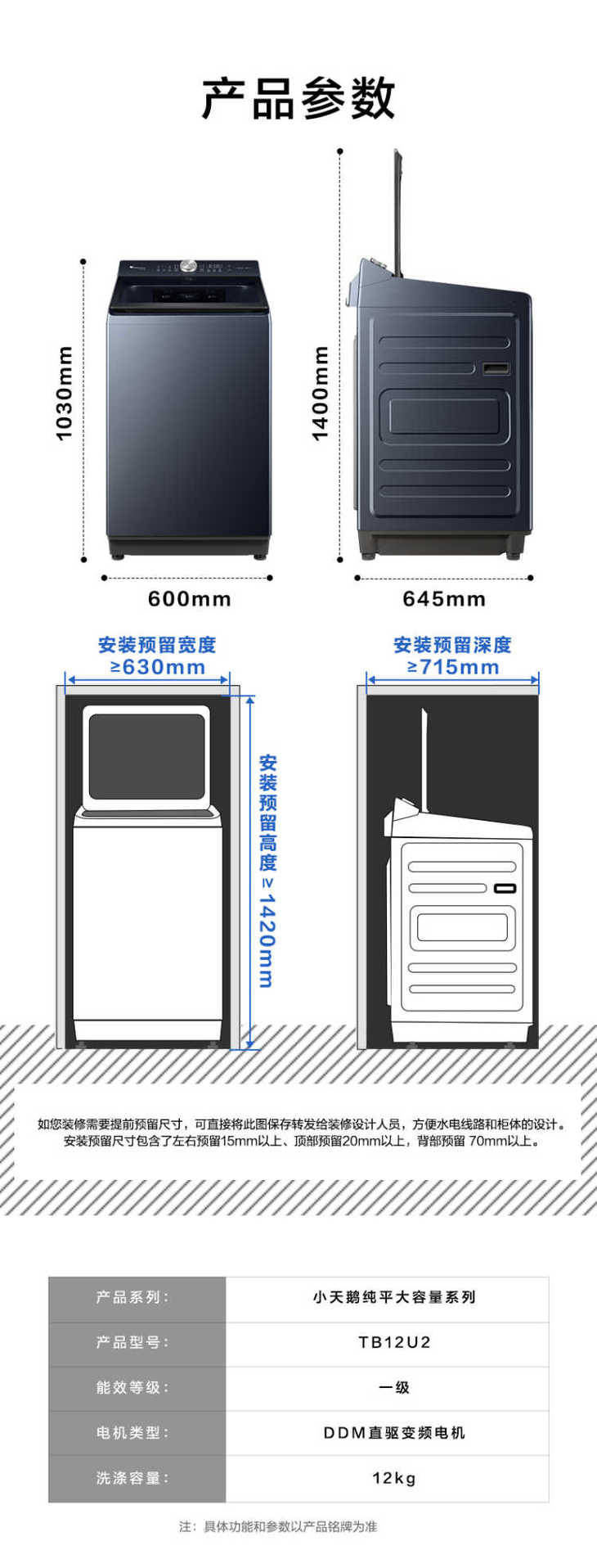 小天鹅(252269)TB12U2 波轮全自动洗衣机 瑾瑜蓝 门盖高光黑 钢化玻璃 波轮式 220V,1Ph 50Hz
