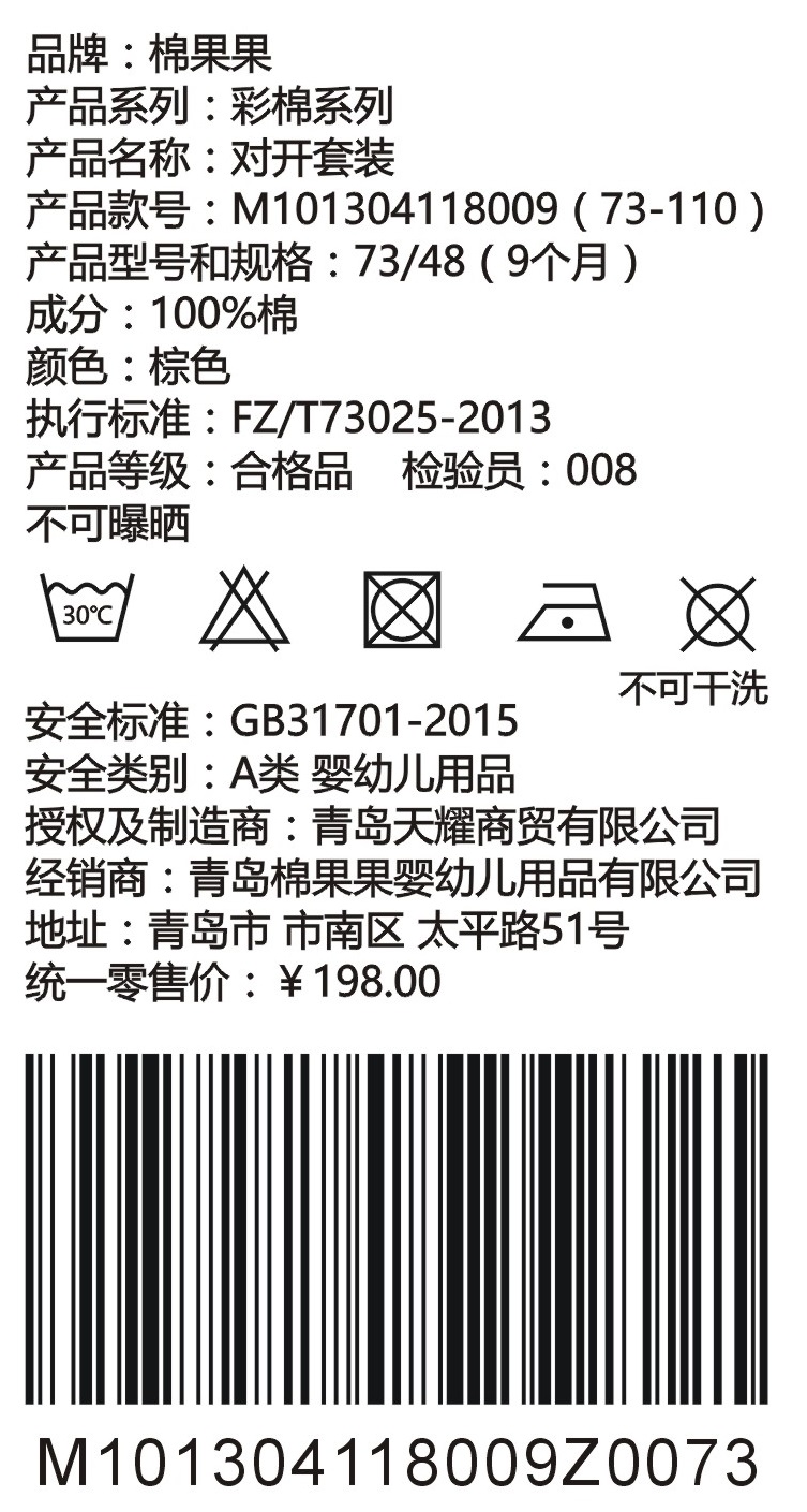 棉果果春秋款新疆彩棉男童女童纯棉汗布上衣+裤子对开套装M101304118009