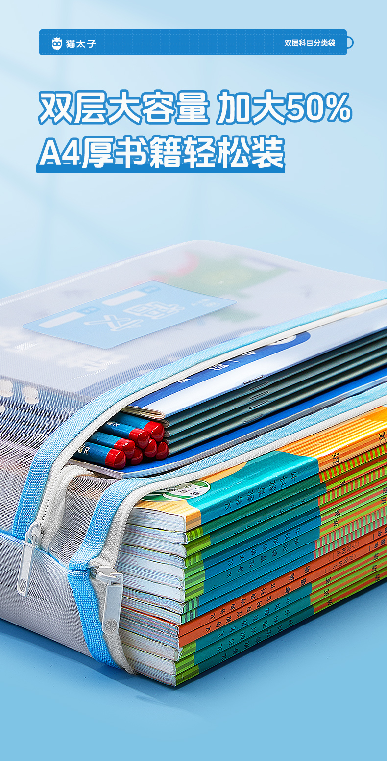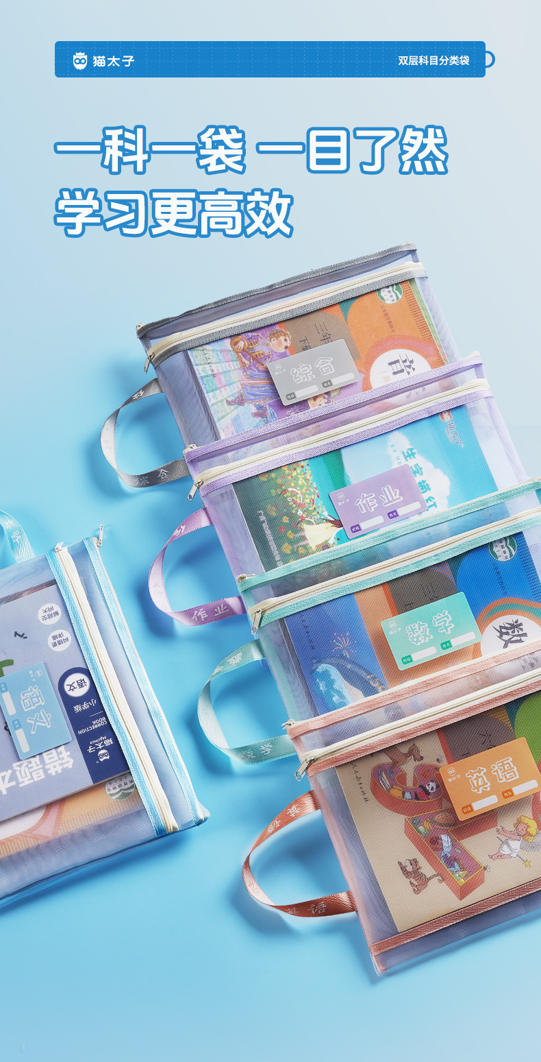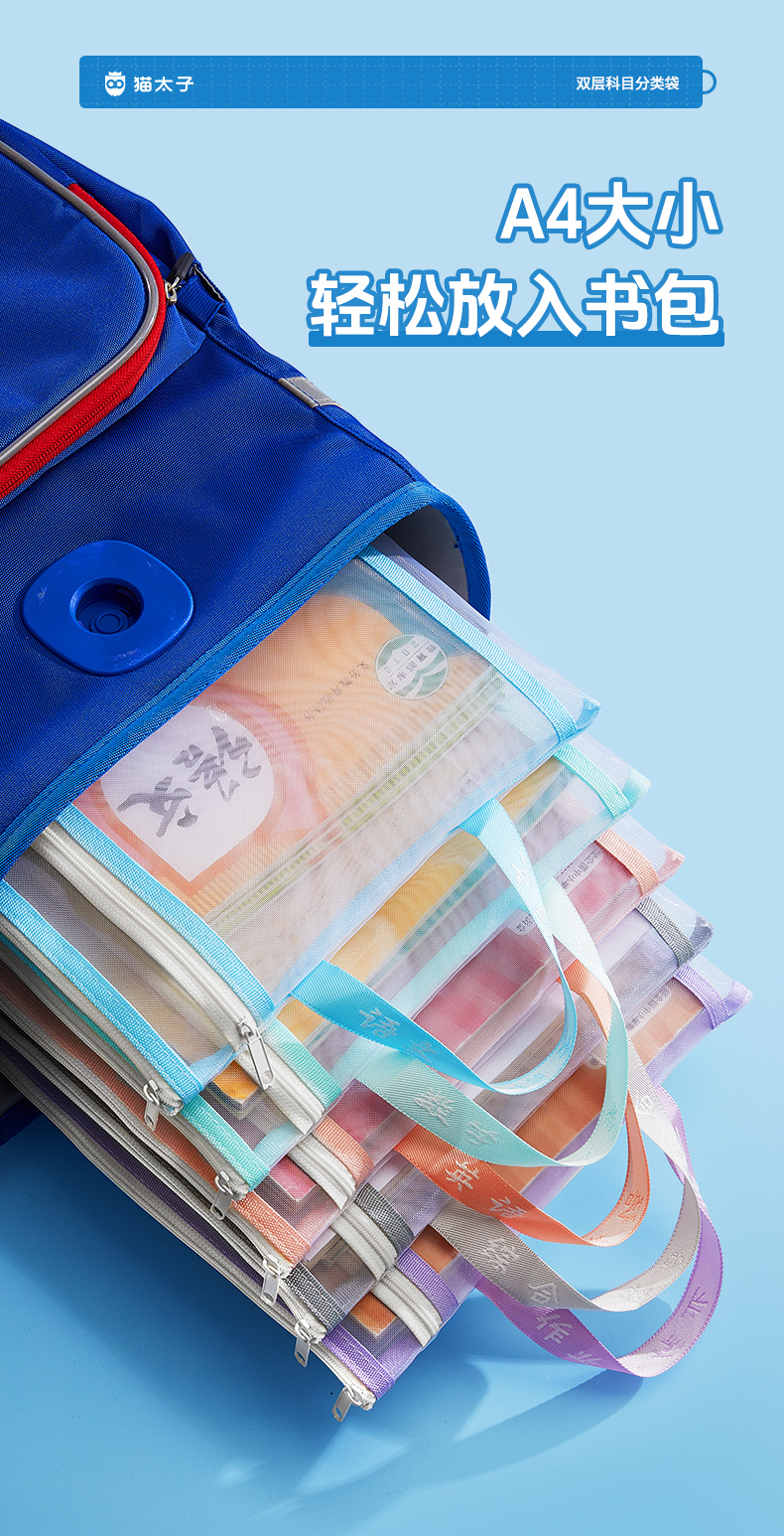 猫太子文件袋拉链式科目分类袋小学生试卷收纳袋透明网纱学科书袋资料卷子补习手提袋学习书本作业拎书袋文具