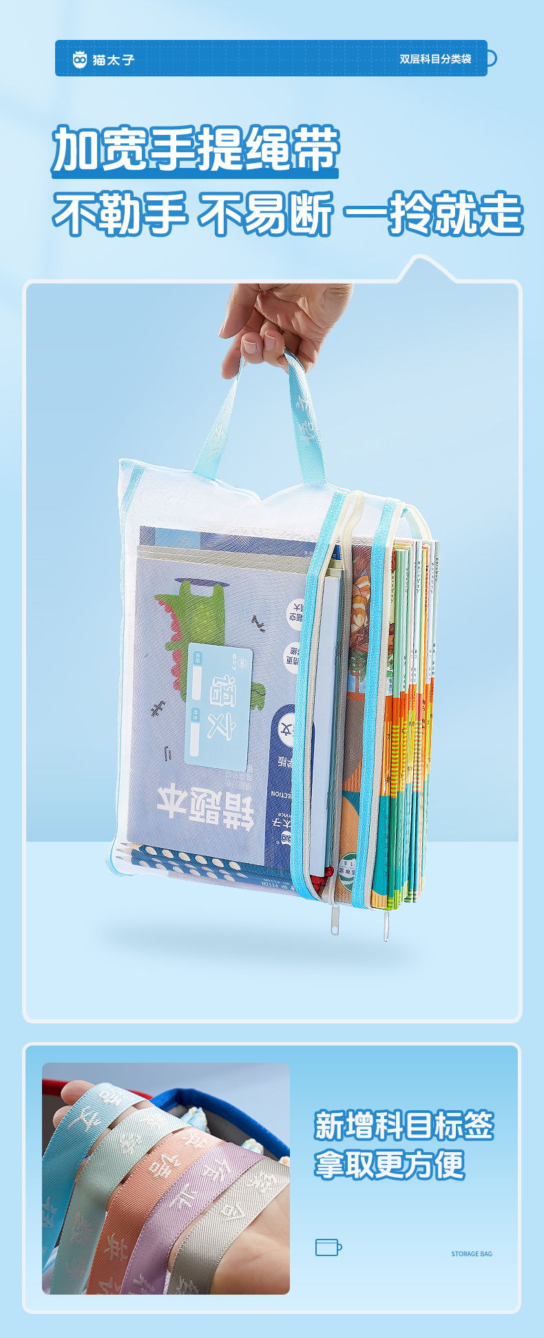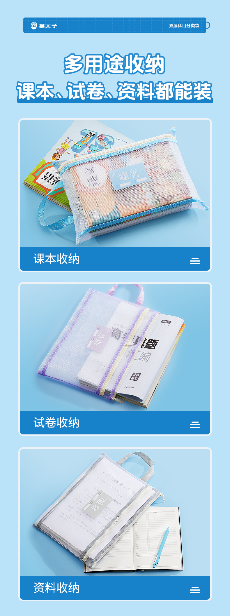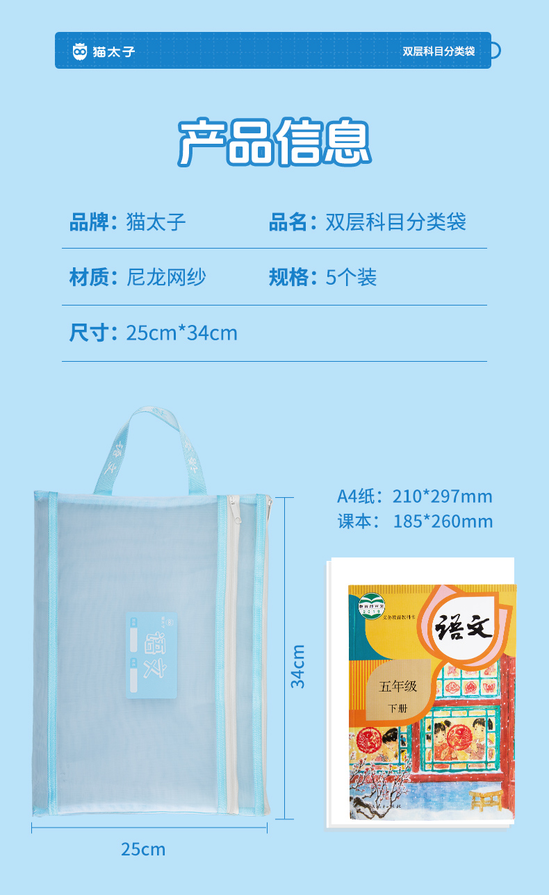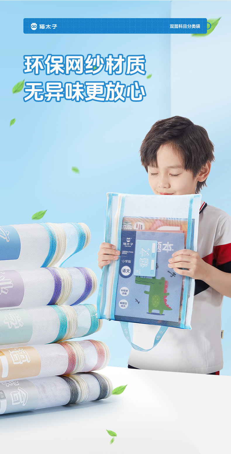 猫太子文件袋拉链式科目分类袋小学生试卷收纳袋透明网纱学科书袋资料卷子补习手提袋学习书本作业拎书袋文具