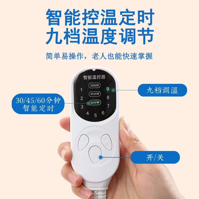 智能控温定时,九档可调遥控器面板简洁,清晰明了操作简单,老人也能掌握加宽加大,享受全身艾灸可做理疗垫、理疗毯
