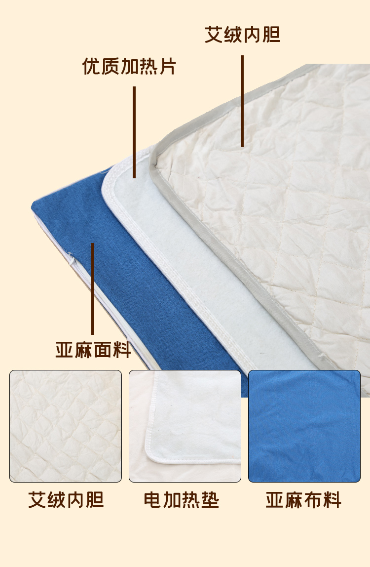 4、建议晚上睡前1小时加热理疗后,拔去电源,可作为床垫使用(不加热),本身有艾绒,药效还会持续作用。