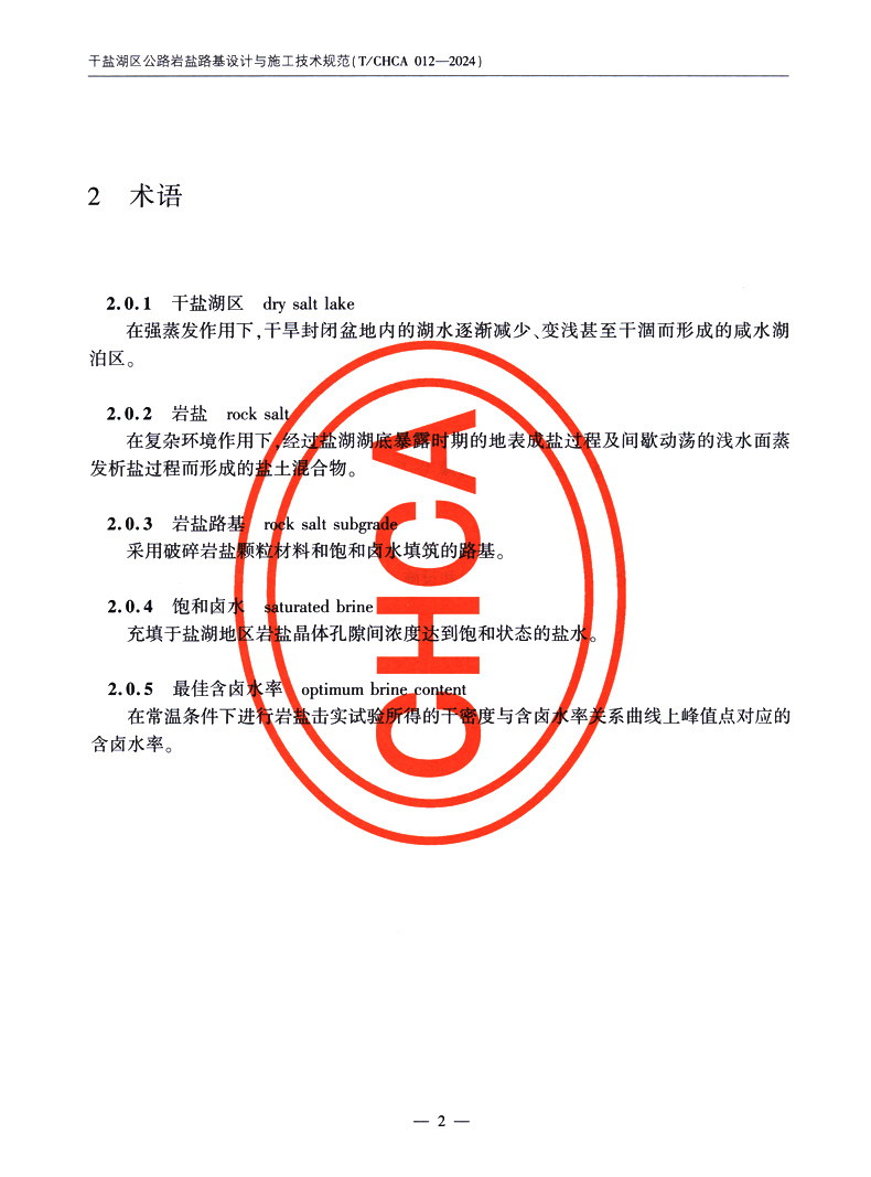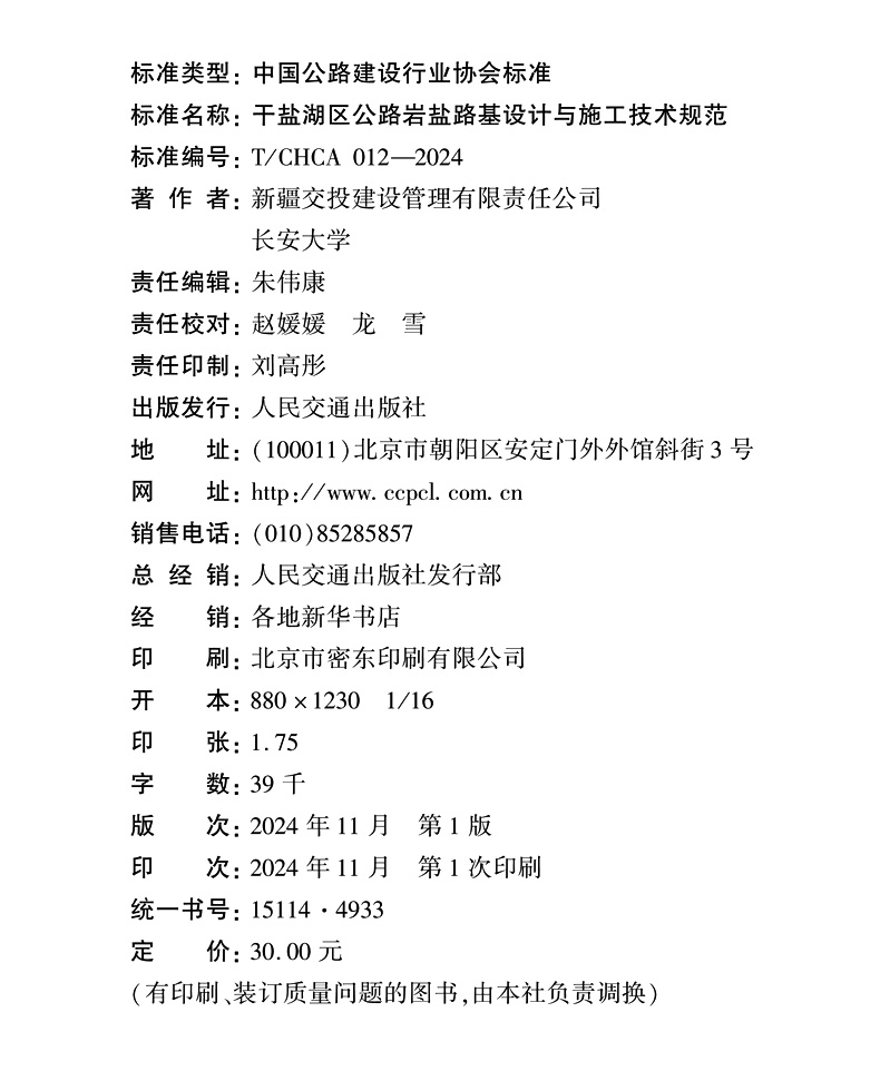 书名:干盐湖区公路岩盐路基设计与施工技术规范(T/CHCA 012—2024)