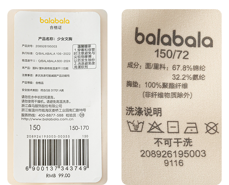 巴拉巴拉女童内衣发育期儿童小背心文胸防凸点防走光舒适吸湿速干