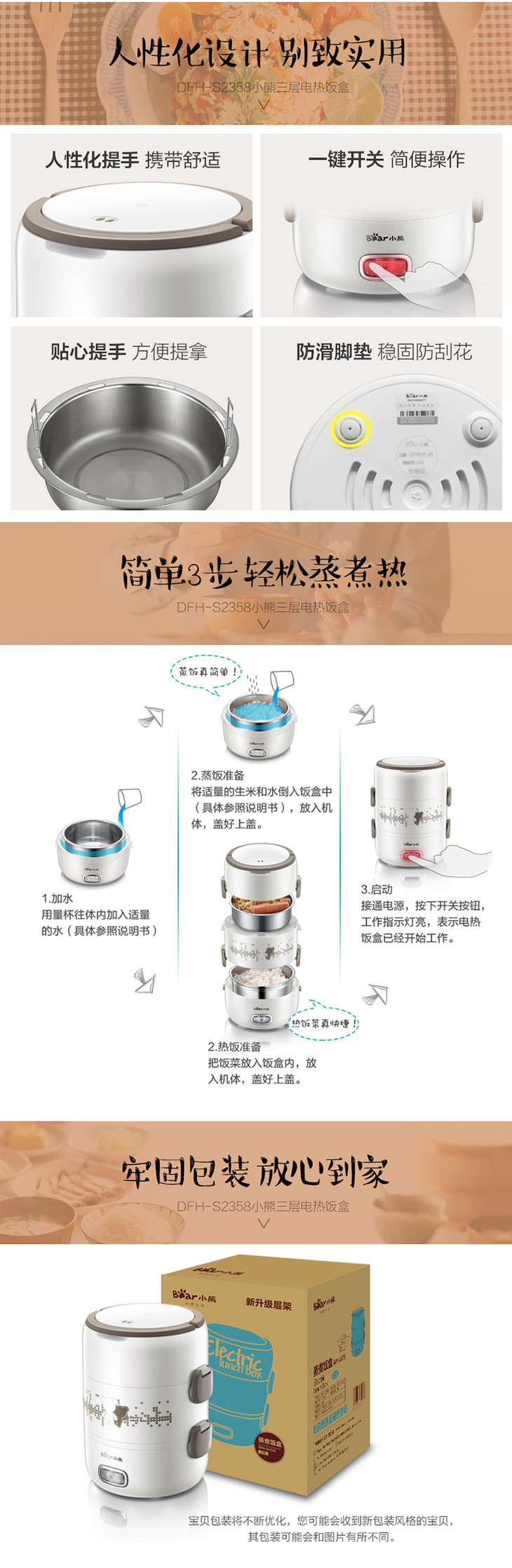 小熊(Bear) 电热饭盒三层保温饭盒可插电加热不锈钢蒸煮饭神器便当盒热饭神器锅 DFH-S2358