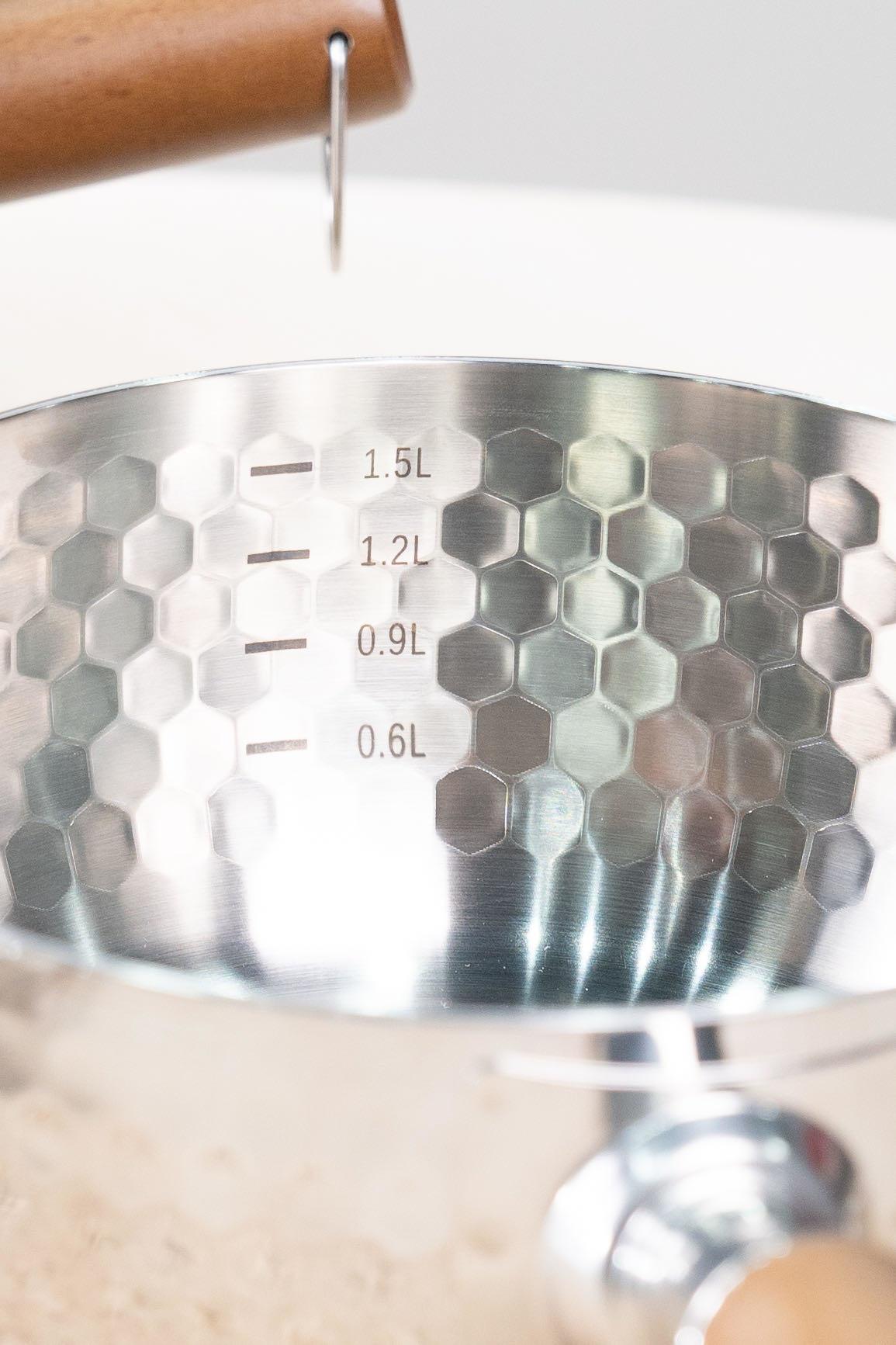 锅内还刻有容量刻度标志,加水量和加奶量一目了然,