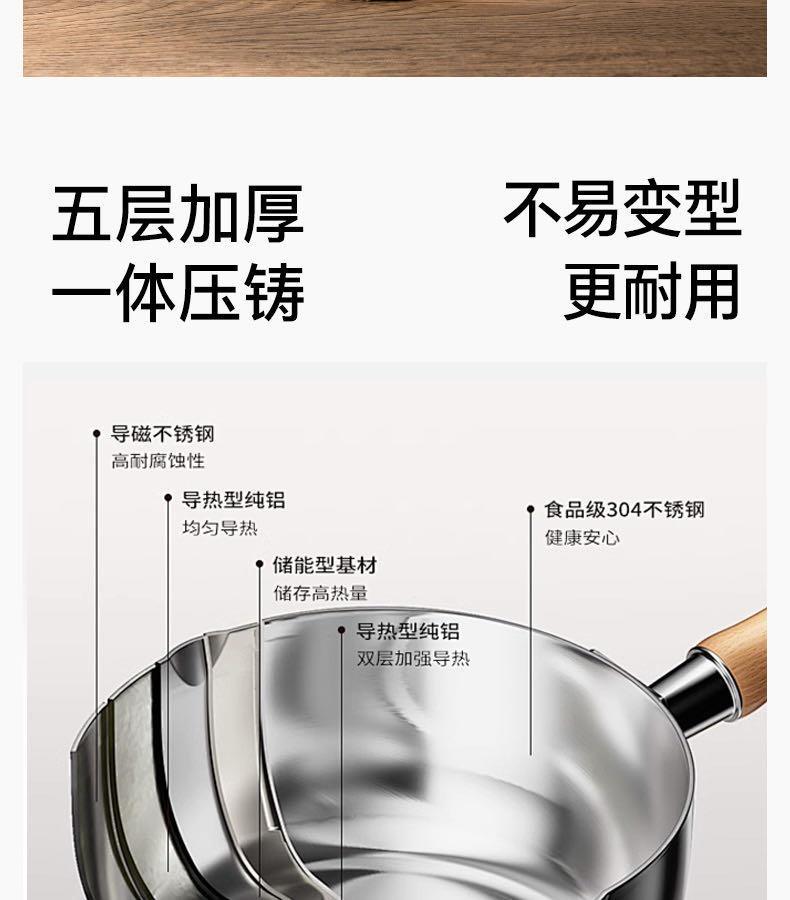 加厚五层304不锈钢制造的,比普通雪平锅厚3倍不止