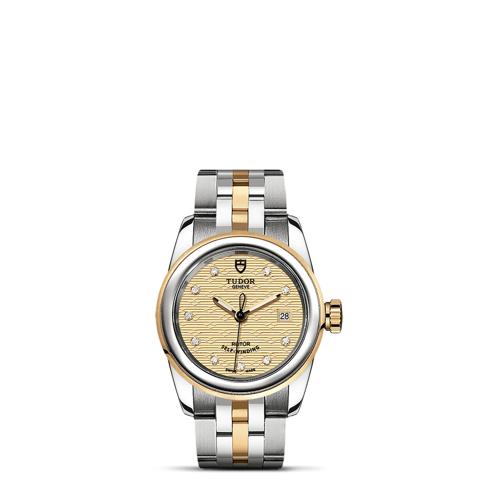 旋入式上链錶冠,饰以帝舵表标志;精钢覆有0.1毫米18K黄金薄层