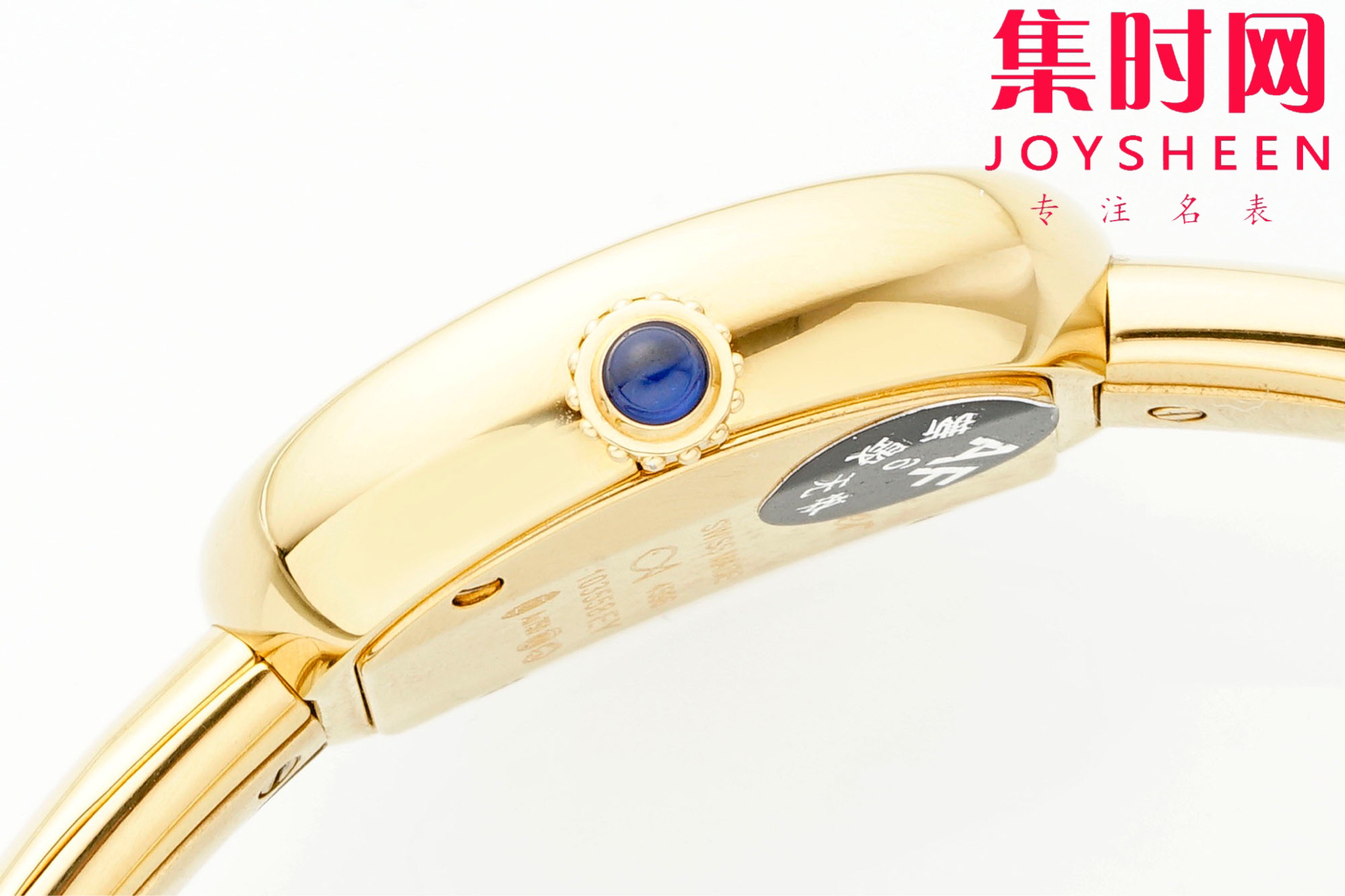 卡地亚设计的手镯式表链,有黄金和玫瑰金材质,而且特意设计的隐藏式安全表扣,完全没有表带的痕迹了。也就是说,你就把它当成"可以看时间的珠宝",还能和其他饰品混搭——一份钱同时拥有珠宝和腕表,还是很快乐的吧。