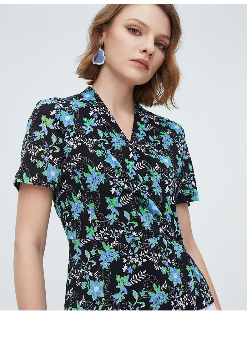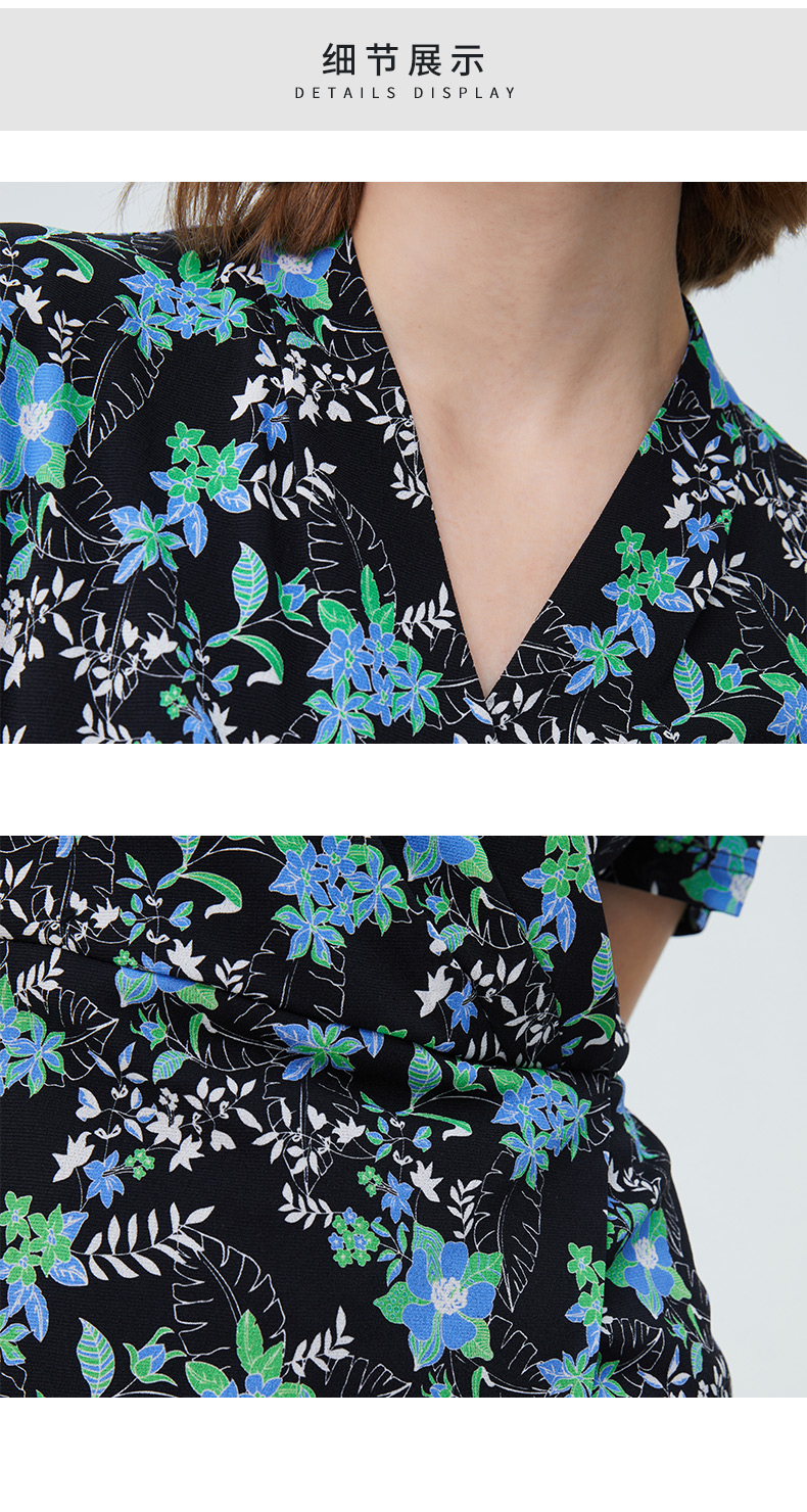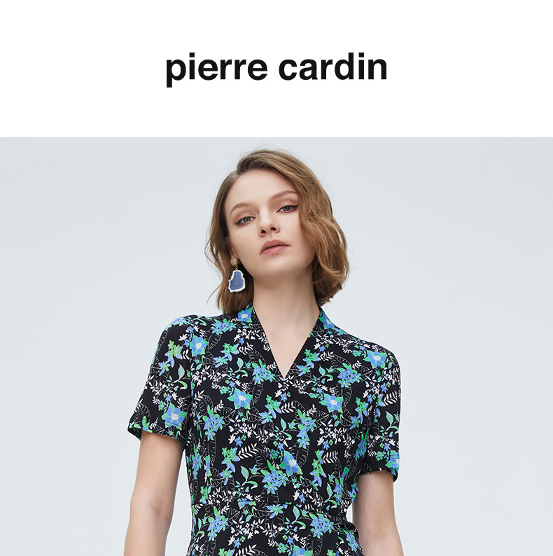 皮尔卡丹女装夏季新款黑色短袖V领蕾丝边连衣裙P0245DS57B3