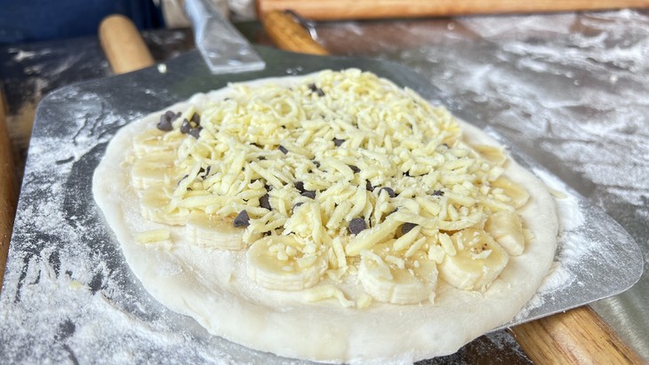香蕉巧克力披萨(甜):有机面粉、天然酵母、少量粉盐、香蕉,巧克力,芝士碎
