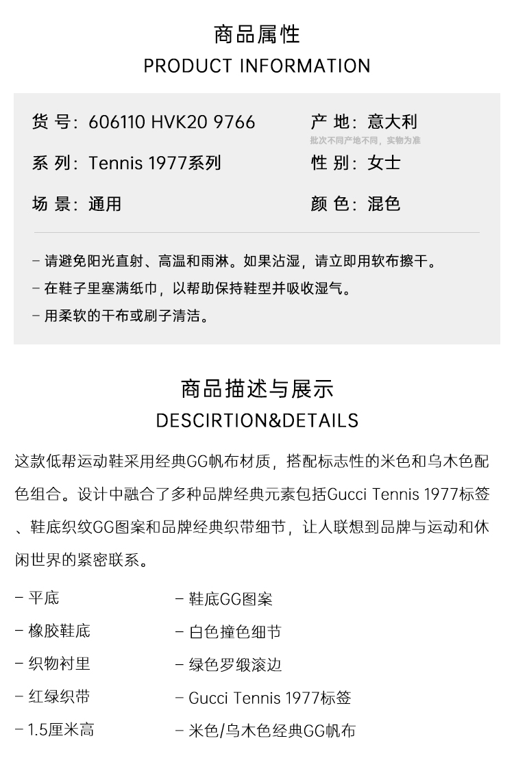 【一】GUCCI 古驰 女士 Tennis 1977系列 系带休闲运动鞋 混色 606110 HVK20 9766