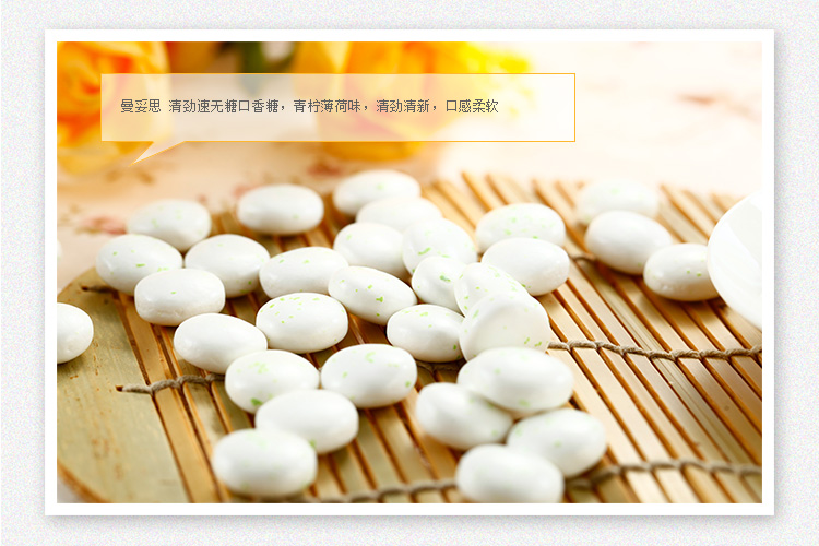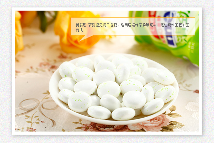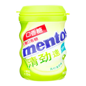 综合介绍 品名:曼妥思清劲速无糖口香糖青柠薄荷味瓶装<br> 净含量 :56克/瓶(约35粒)<br> 配料: 食品添加剂、胶基、食用香精、速溶绿茶粉<br> 产品标准号:SB/T 10023(夹心咀嚼型胶基糖果)<br> 生产许可证:QS3112 1301 0004<br> 保质期 :24个月<br> 贮存方法:贮存于阴凉、干燥处、避免重压 |