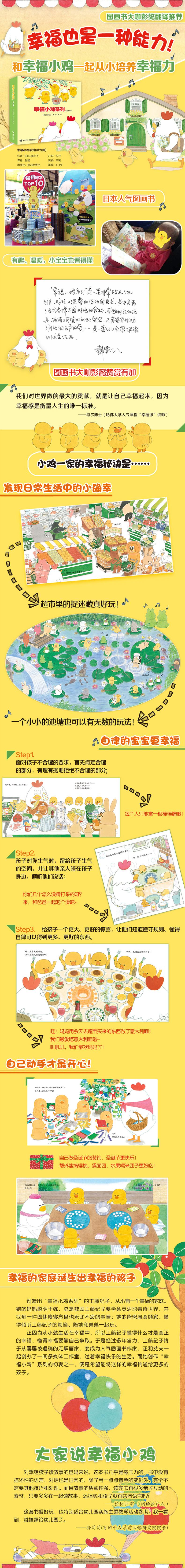 “幸福小鸡系列”是日本人气图画书作家工藤纪子为2-5岁幼儿创作的生活图画书。萌萌的小鸡五胞胎,在聪明能干的鸡妈妈和温柔顾家的鸡爸爸陪伴下,一起逛超市、过生日、去游乐园、去外婆家……每天都过得快乐又幸福。暖暖的家族温情、趣味十足的日常生活细节,以及萌圆可爱的小动物们,令它刚一诞生就受到了读者们的热烈欢迎。“幸福小鸡”系列目前共6册。本册书主要讲述了:小鸡们要过生日了,鸡妈妈带着小鸡们去蛋糕店。好吃的蛋糕、奶酪还有大布丁,选哪个好呢……咦,爸爸今天会提前回来吗?他会带什么生日礼物呢?真期待啊!细腻地描绘了蛋糕店和玩具店真实的场景,好看、好玩又好吃的生日图画书。