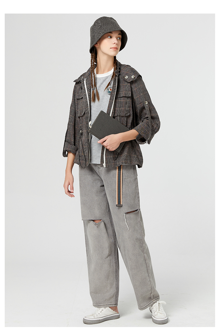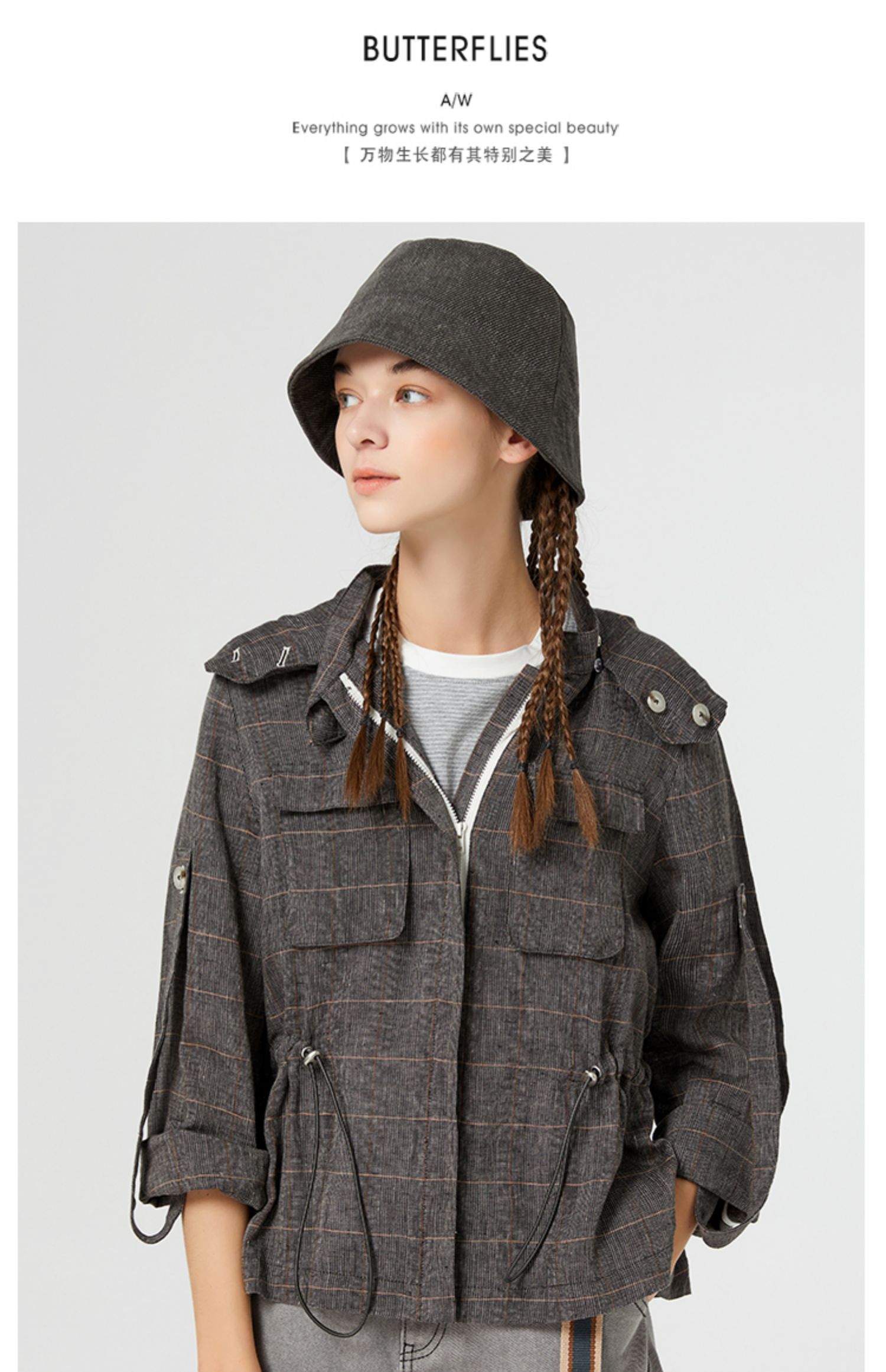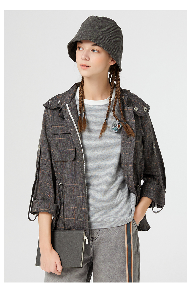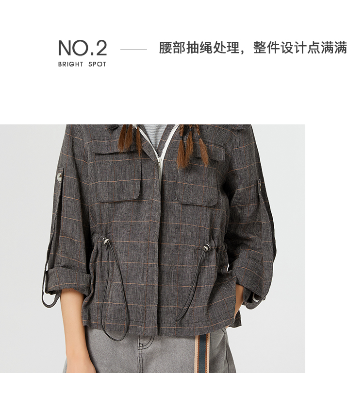 Famecoco范可儿复古夏季格子外套女新款工装夹克高级范短款F223AB009